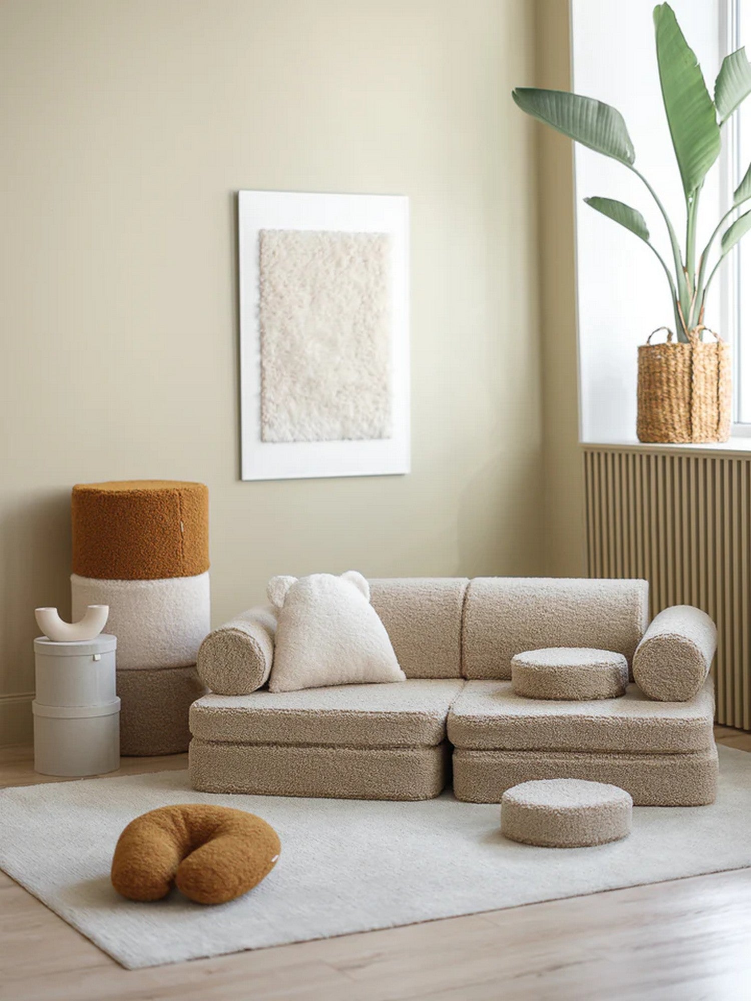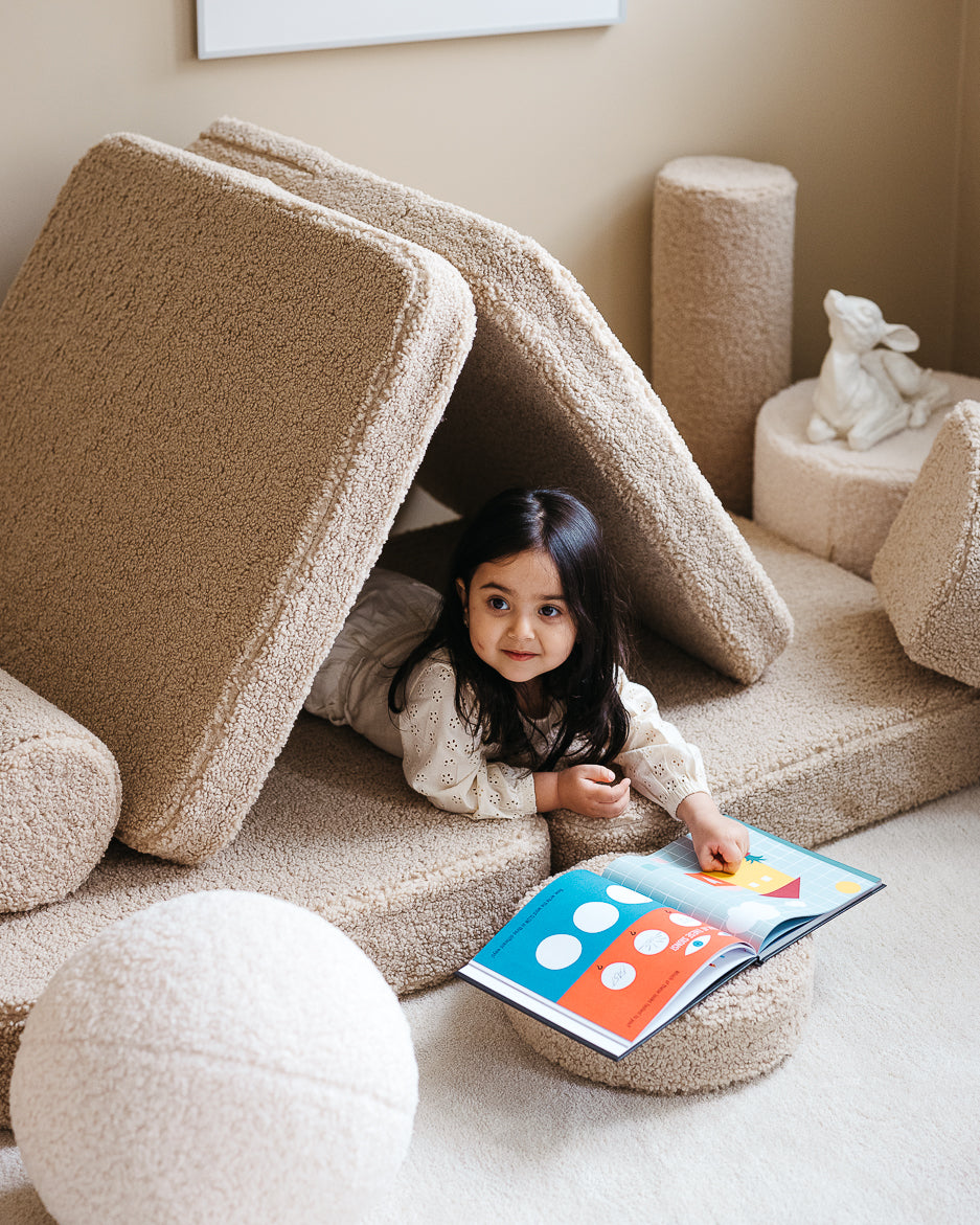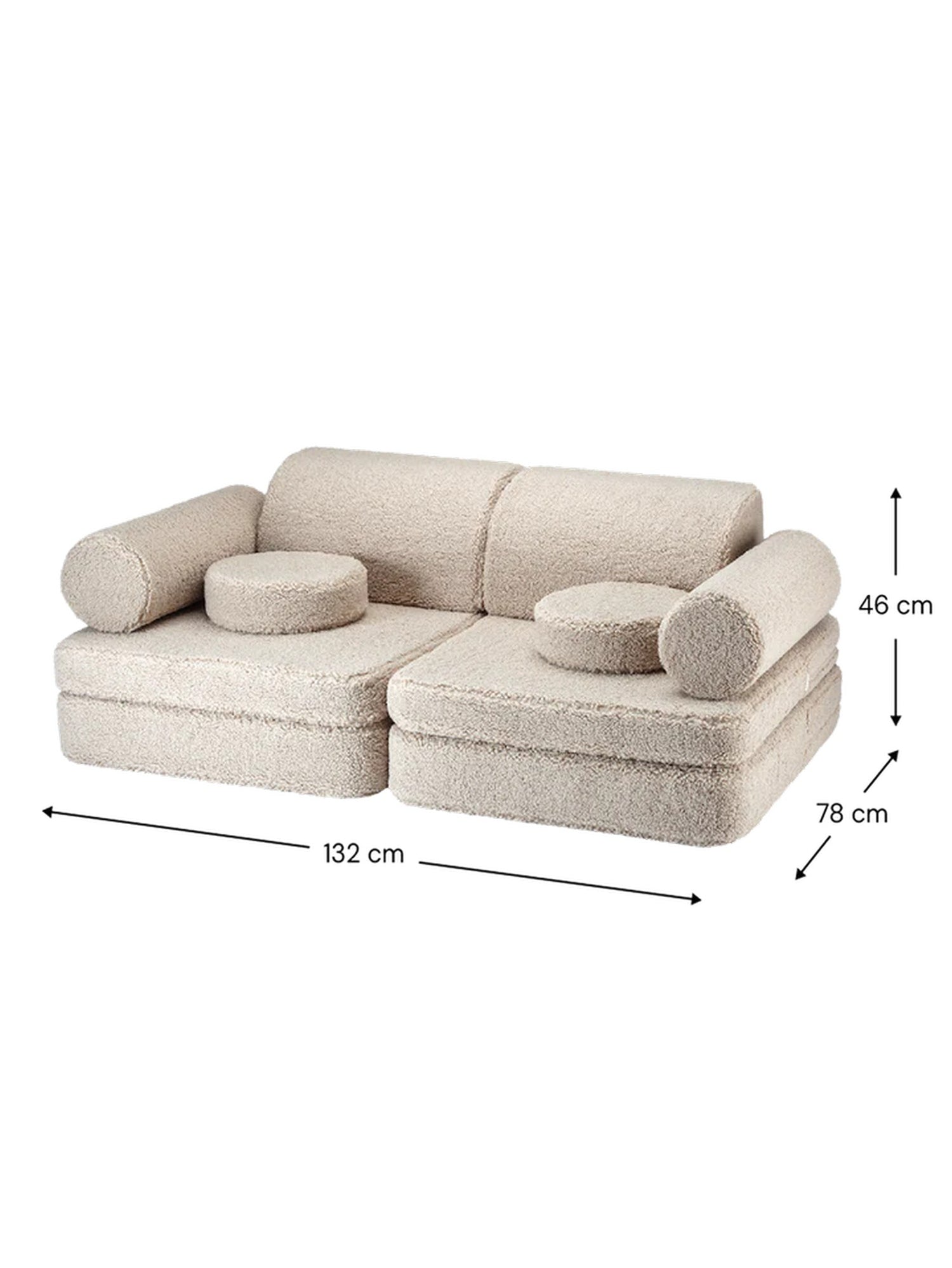 Das Sofa besteht aus insgesamt 9 Teilen, darunter zwei Sitzkissen, ein großes Sitzkissen, zwei dreieckige Kissen als Rückenlehnen, zwei Rollkissen als Armlehnen und zwei runde Kissen. Diese Kombination ermöglicht unbegrenzte Möglichkeiten für fantasievolles Spielen und kreativen Ausdruck.