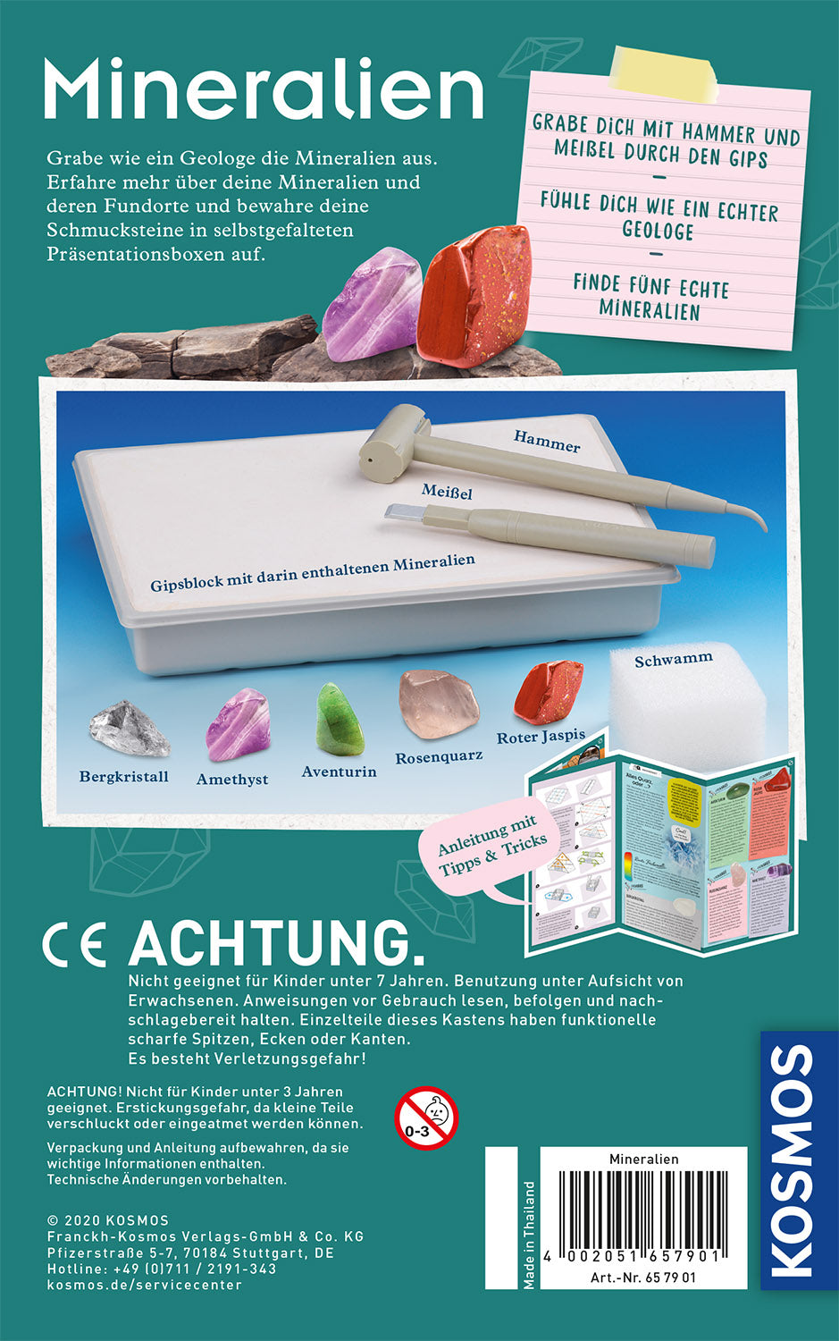Inhalt: Gipsblock mit 5 Mineralien (Bergkristall, Rosenquarz, Amethyst, Aventurin, Roter Jaspis), Werkzeug (Hammer, Meißel), Schwamm