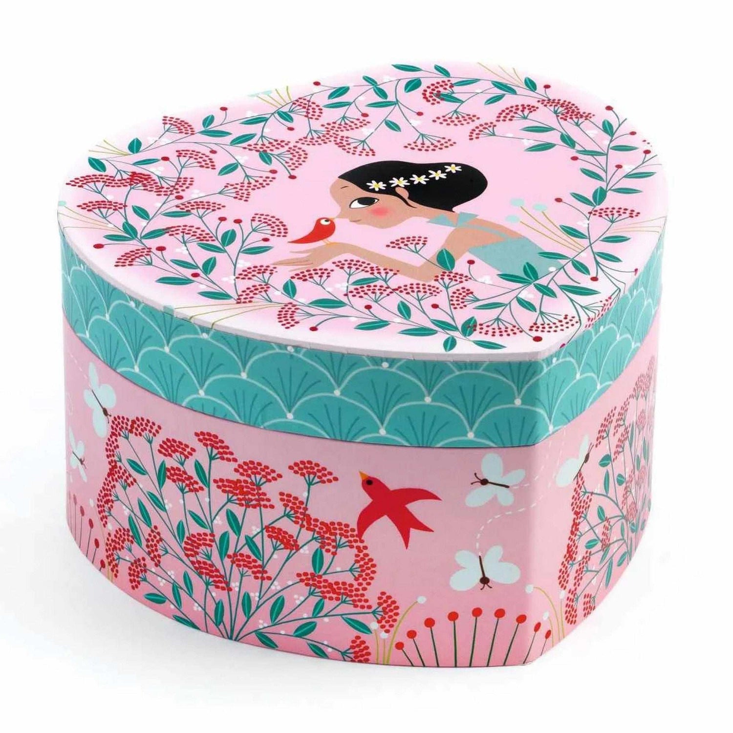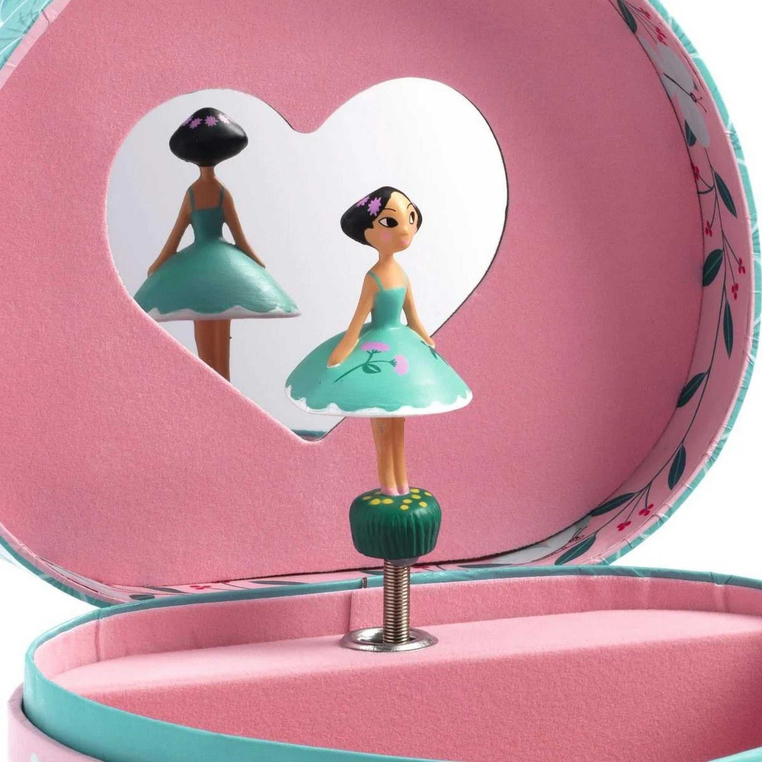„Mélodie du printemps“ von Djeco ist ein schön gestaltetes Musikschmuckkästchen in Herzform zur Aufbewahrung von Schmuck und Geheimnissen. Drehen Sie die Kurbel, öffnen Sie das Kästchen und erleben Sie eine Überraschung! Eine fein modellierte Tänzerin dreht sich und spiegelt sich in einem speziell geformten Spiegel zu den Klängen von „Einladung zum Walzer“ von Carl Maria von Weber. • Innen mit weichem Samt ausgekleidet. • Spiegel eingerahmt in eine schöne Illustration. • Die Spieldauer beträgt ca. 2,5 Minuten. • Eine schöne Dekoration für das Kinderzimmer und das perfekte Geschenk zur Geburt. Inhalt: Ein mit Papier überzogenes Musikschmuckkästchen mit einer hübschen Figur, innen mit Samt ausgekleidet. Modell: DJ06089 Produktgröße: 14,7 x 14,2 x 8,5 cm Verpackungsgröße: 15,3 x 15,1 x 9,1 cm Material: Holz, Samt, Metall, Kunststoff Altersempfehlung: ab 4 Jahre