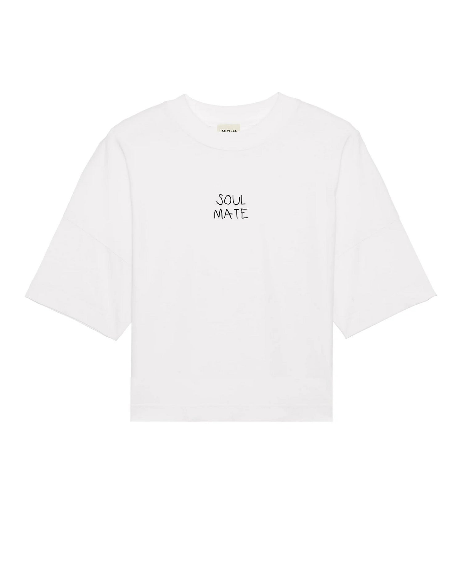Dieses lässig geschnittenes Unisex-Shirt von Fam Vibes, besitzt gleich zwei coole Prints: Auf der Vorderseite SOULMATE und auf der Rückseite ein gescribbeltes Kirschenduo mit dem "Ministatement" BELONG TOGETHER...