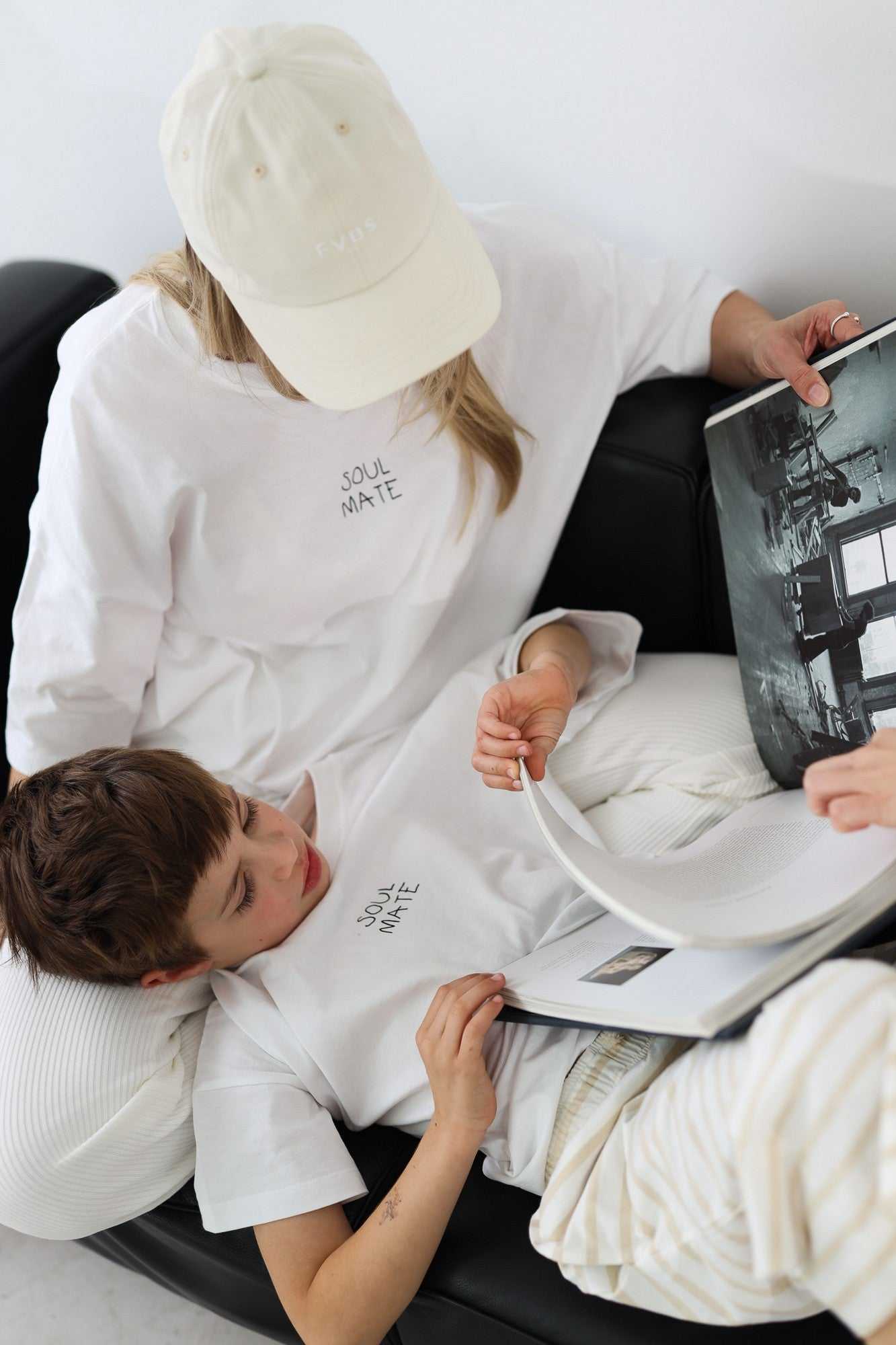 Dieses lässig geschnittenes Unisex-Shirt von Fam Vibes, besitzt gleich zwei coole Prints: Auf der Vorderseite SOULMATE und auf der Rückseite ein gescribbeltes Kirschenduo mit dem "Ministatement" BELONG TOGETHER...