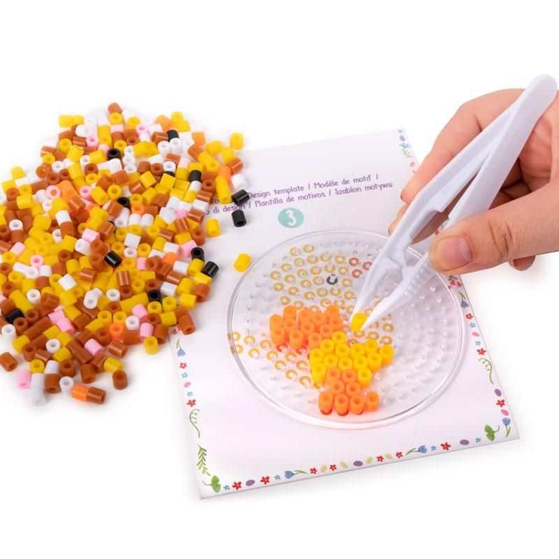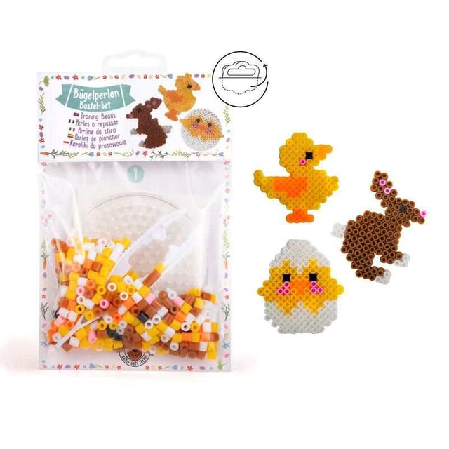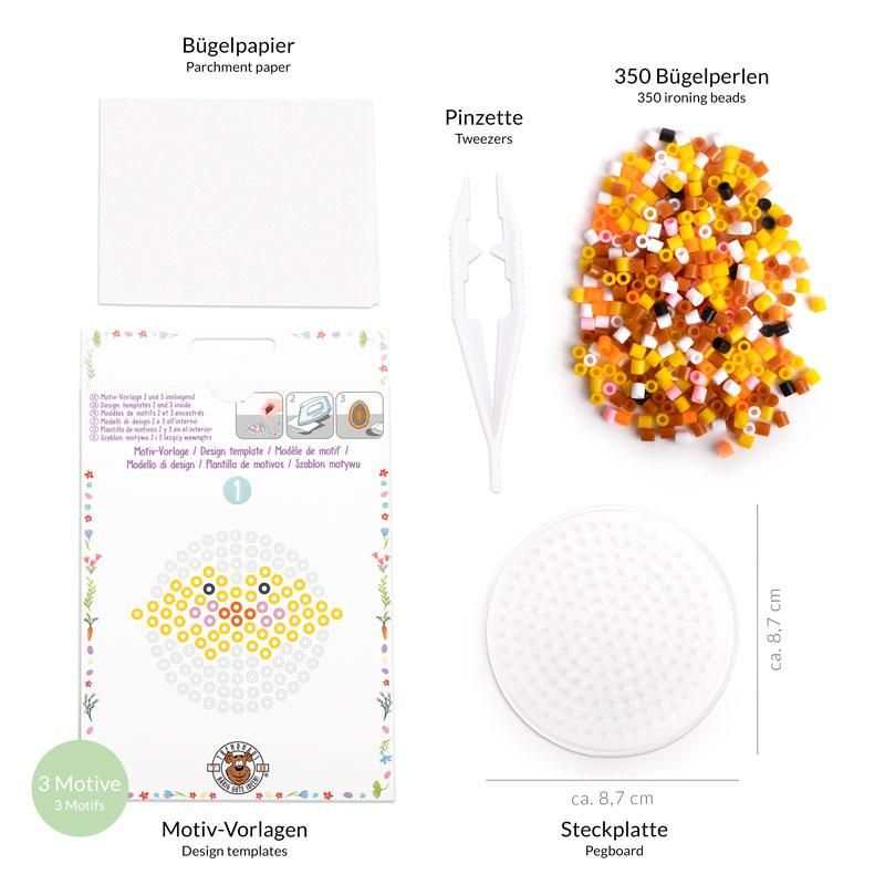 Inhalt: 3 Motiv-Vorlagen (Küken, Hase, Küken im Ei), Steckplatte (Ø 8,7 cm), ca. 350 Bügelperlen, Pinzette, Bügelpapier