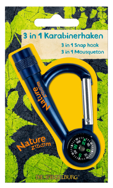 Mit dem 3 in 1 Karabinerhakten Nature Zoom vom Coppenrath hat eine Taschenlampe, Kompass und Karabiner in einem. Den Karabiner, kann man problemlos an die Hose oder an den Wanderrucksack befestigen und ihn bei belieben ab nehmen um die neuen Gebiete zu erforschen. Mit dem Kompass hat ihr Kind die ersten kontakte mit der Orientierung und erlebt haut nah das Magnetfeld der Erde.
