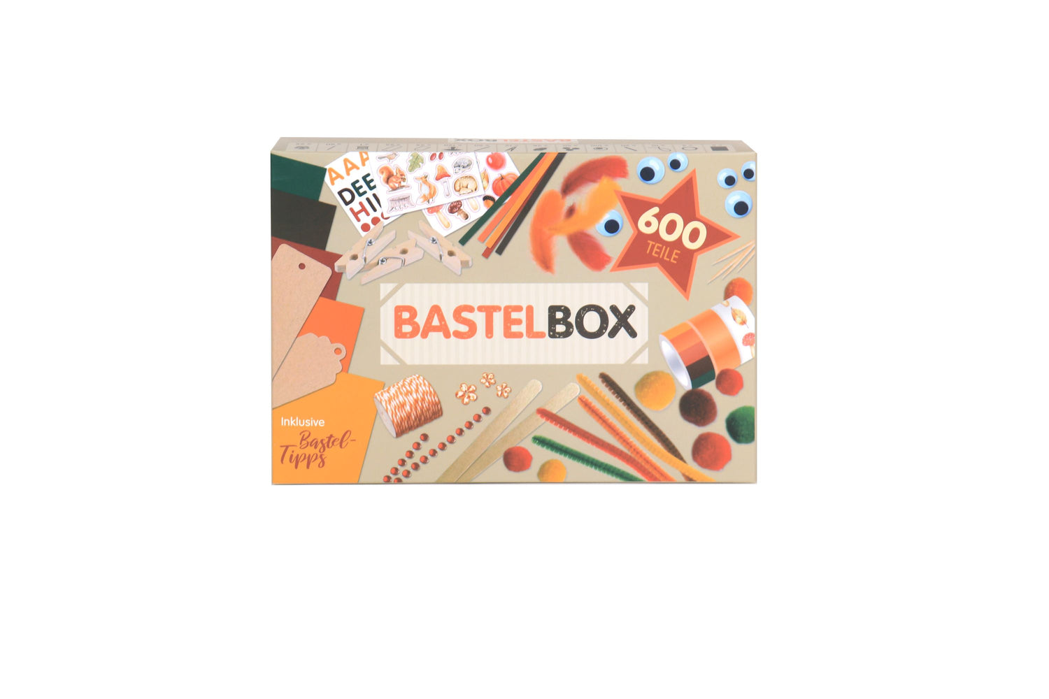 Wow, was für eine Mega Bastelbox - diese Vielfalt an Materialien bietet unzählige Gestaltungsmöglichkeiten für kreative Bastelideen. Alle 600 Teile in der Box sind sorgfältig aufeinander abgestimmt und ergeben einen harmonischen Farbmix. Dadurch lasst ihr einzigartige Bastelwerke mit viel Liebe zum Detail entstehen. Die beiliegende Anleitung bietet sechs inspirierende Ideen, um den Einstieg zu erleichtern, aber genügend Raum für eigene Fantasien zu lassen. Ihr könnt als Familie basteln oder die Kinder haben ein bisschen "Allein-Spielzeit" und zeigen euch später ihre Kunstwerke. Auch für Kindergeburtstage ist diese Box perfekt, denn die Kinder machen etwas gemeinsam, sind sinnvoll beschäftigt und haben auch noch ein kleines, selbstkreiertes Andenken, welches sie mit nach Hause nehmen können. Diese vielseitige Bastelbox ist ein tolles Geschenk für jeden Anlass und bringt nicht nur Kinderherzen zum Strahlen. Taucht ein in eine phantasievolle Welt des Bastelns und erlebt, wie aus 600 Teilen unvergessliche Kunstwerke entstehen. Inhalt: * 5 Tonpapierblätter * 3 Washi Tapes * 10 Chenille Drähte * 20 Holzstäbchen * 100 Wackelaugen * 50 Pompons * 36 Marabu Federn * 12 Holzklammern * 50 Papierstreifen 7mm * 120 Papiersticker * 25 Geschenkanhänger * 25 Lesezeichen * 1 Rolle Kordel * 60 Zahnstocher * 95 Diamant Sticker * inklusive Bastelanleitung für 6 kunterbunte Bastelideen * Kleine Drachen, Lustige Vögel, Happy Birds, Herbst Zapfen, Herbst Blätter, Lieblings Eule