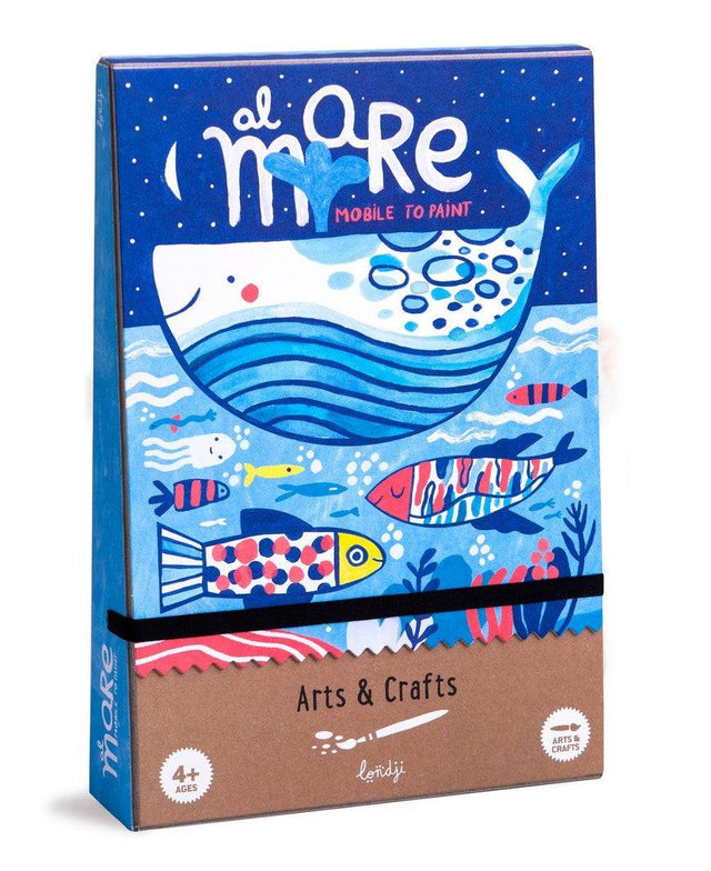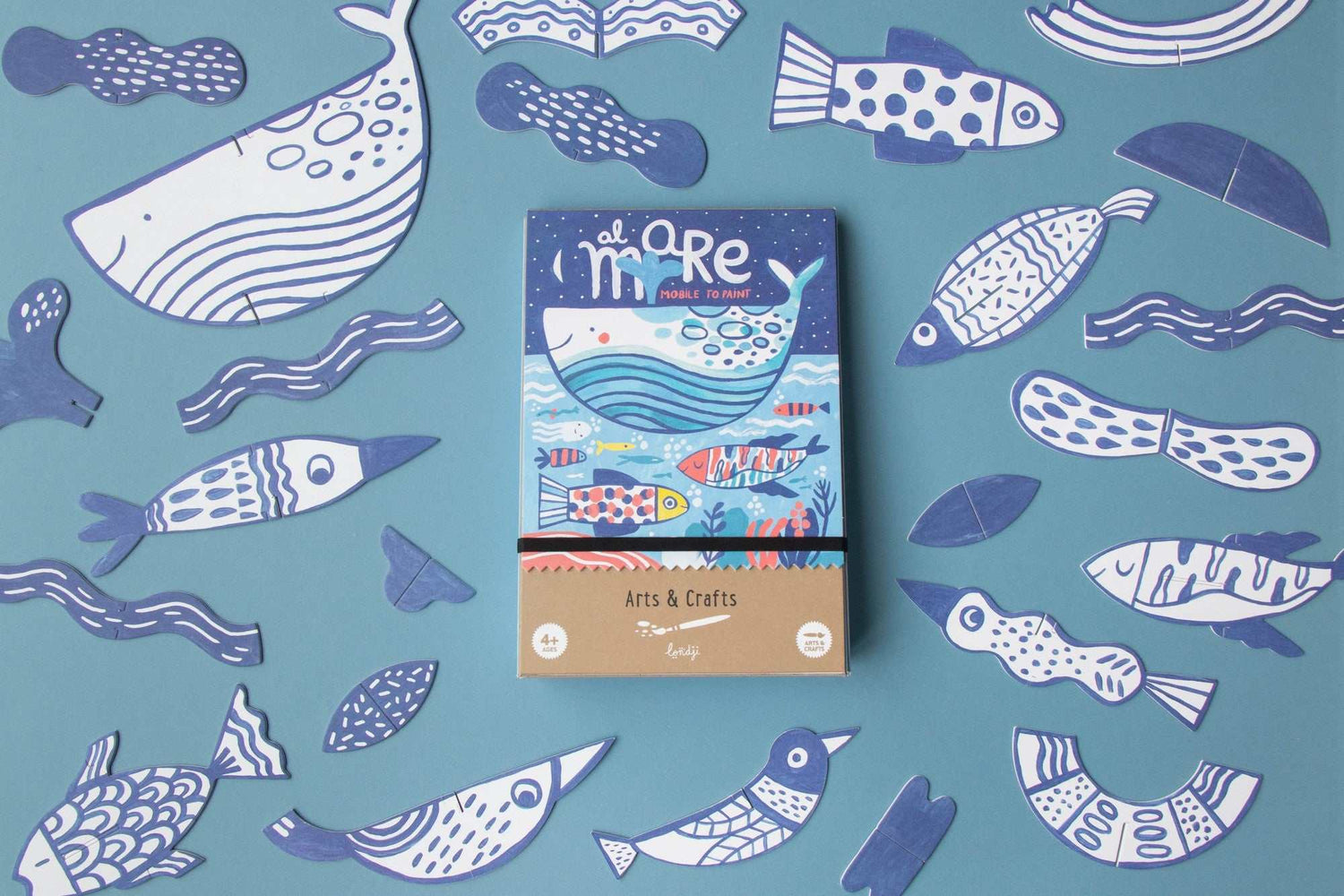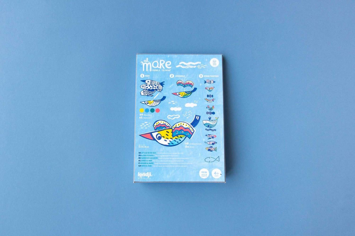 Baue und bemale Dein eigenes Meerestiere-Mobile mit dem Bastelset Al Mare von Londji. Das innovative Bastelset wird mit einem kleinen Farbkasten mit Pinsel, einem Mobile, welches noch bemalt und zusammengebaut werden soll und viel Spaß geliefert.