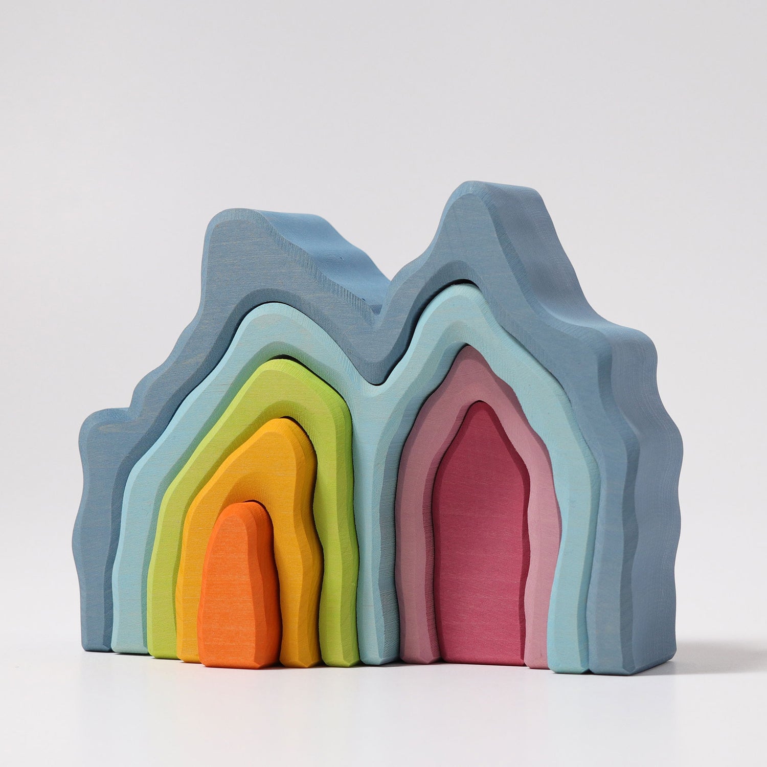 Die verschiedenen Bau- Sets von Grimms ergänzen sich gegenseitig durch die verschiedenen Bauelementformen und ermöglichen Ihrem Kind so ein vielseitiges und fantasiereiches Spiel.