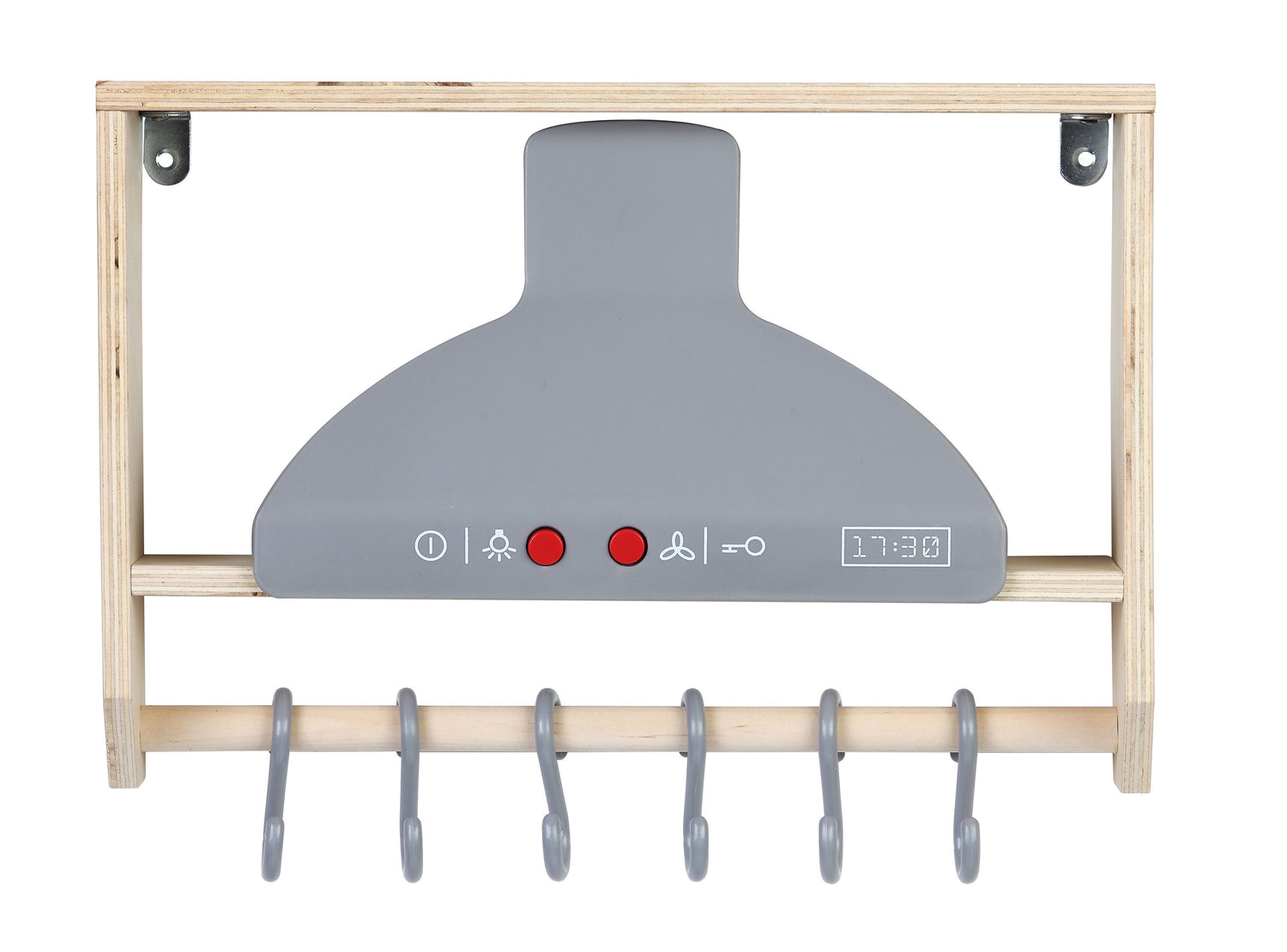 Dunstabzugshaube aus Holz von Mama Memo für passende Kinderküchen mit Haken zum Aufhängen von Kochlöffeln und Co.