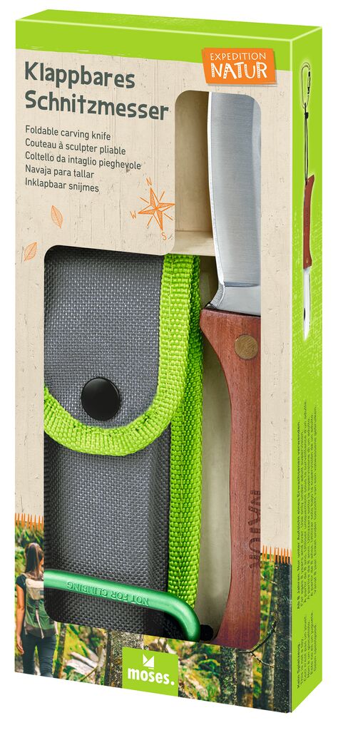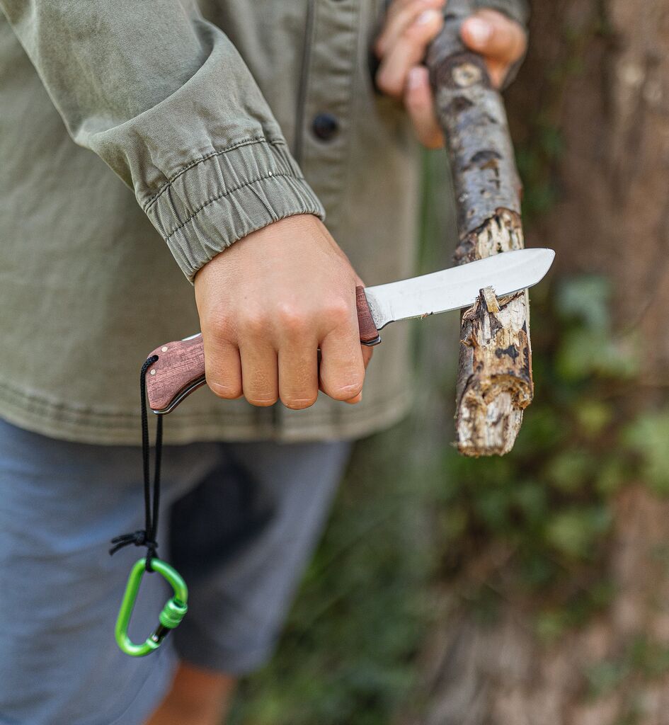 Das klappbare Schnitzmesser mit Holzgriff ist ein zuverlässiger Begleiter im Alltag sowie bei großen und kleinen Abenteuern im Grünen. Mit einem Karabiner kann das Messer am Rucksack, der Tasche oder der Jacke befestigt und bei Bedarf schnell vom Haken gelöst werden. Dank der abgerundeten Spitze wird auch Kindern ein problemloser und sicherer Umgang mit dem Schnitzmesser ermöglicht – so steht dem kreativen Äste-Schnitzen nichts mehr im Wege. Ob zum Zurechtschnitzen der Halterungen für Stockbrot am gemütlichen Campingfeuer, als vielseitig einsetzbare Ausrüstung bei der Wanderung durch den Wald oder zum Basteln mit Naturmaterialien: Dieses Schnitzmesser darf bei kleinen Entdeckern nicht fehlen.