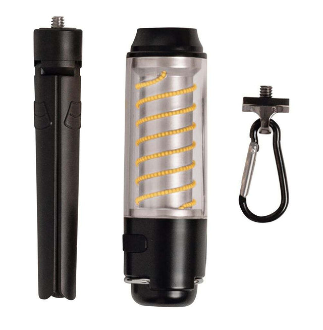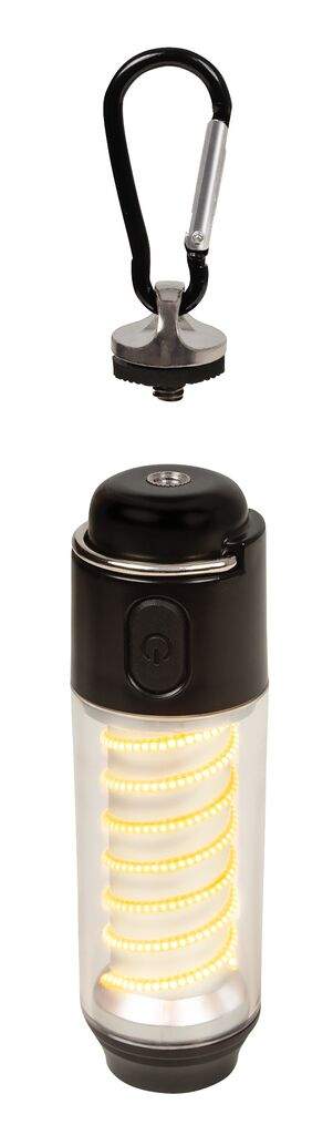 Das Licht ist mehrfach einsetzbar, mit flexiblem Ständer zum Aufstellen. Ein anschraubbarer Karabiner ermöglicht zudem das Aufhängen des Allroundlichts.