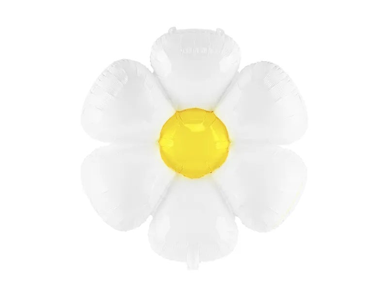 Da kommen Frühlingsgefühle auf! Glänzender Folienballon Gänseblümchen in Weiß mit gelbem Aufdruck von Partydeco, Größe vor dem Aufblasen ca. 97 x 103 cm, aufgeblasen ca. 70 x 80 cm (27,5 x 31,5''). Kann mit Luft oder Helium aufgeblasen werden.