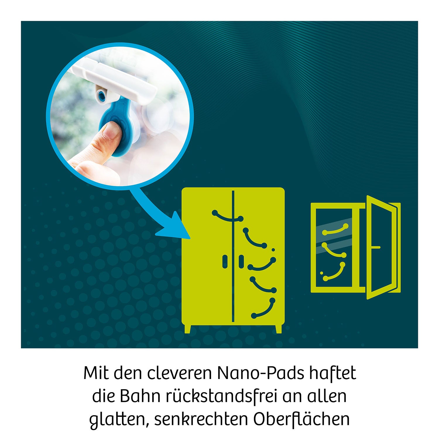 Mit den rückstandsfreien haftenden Nano-Pads werden die Bahnen ganz individuell an senkrechten, glatten Oberflächen befestigt und in Sekundenschnelle umgesetzt und feinjustiert.