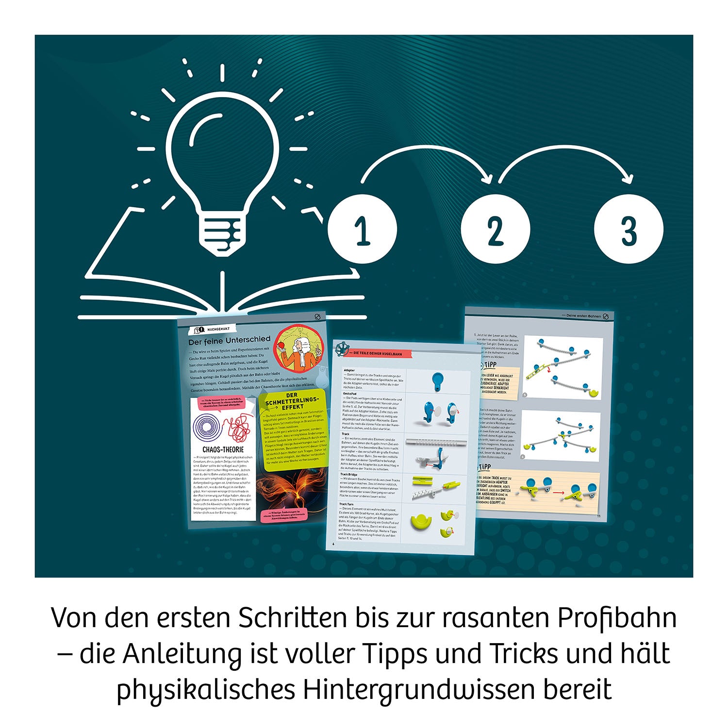Inhalt: - 27 Adapter- 12 Bahnen- 2 Lever- 4 Track Turns- 3 Track Bridges- 1 Switch- 1 Trichter- 7 Stahlkugeln- 40 Nano-Haftpads- farbig illustrierte Anleitung
