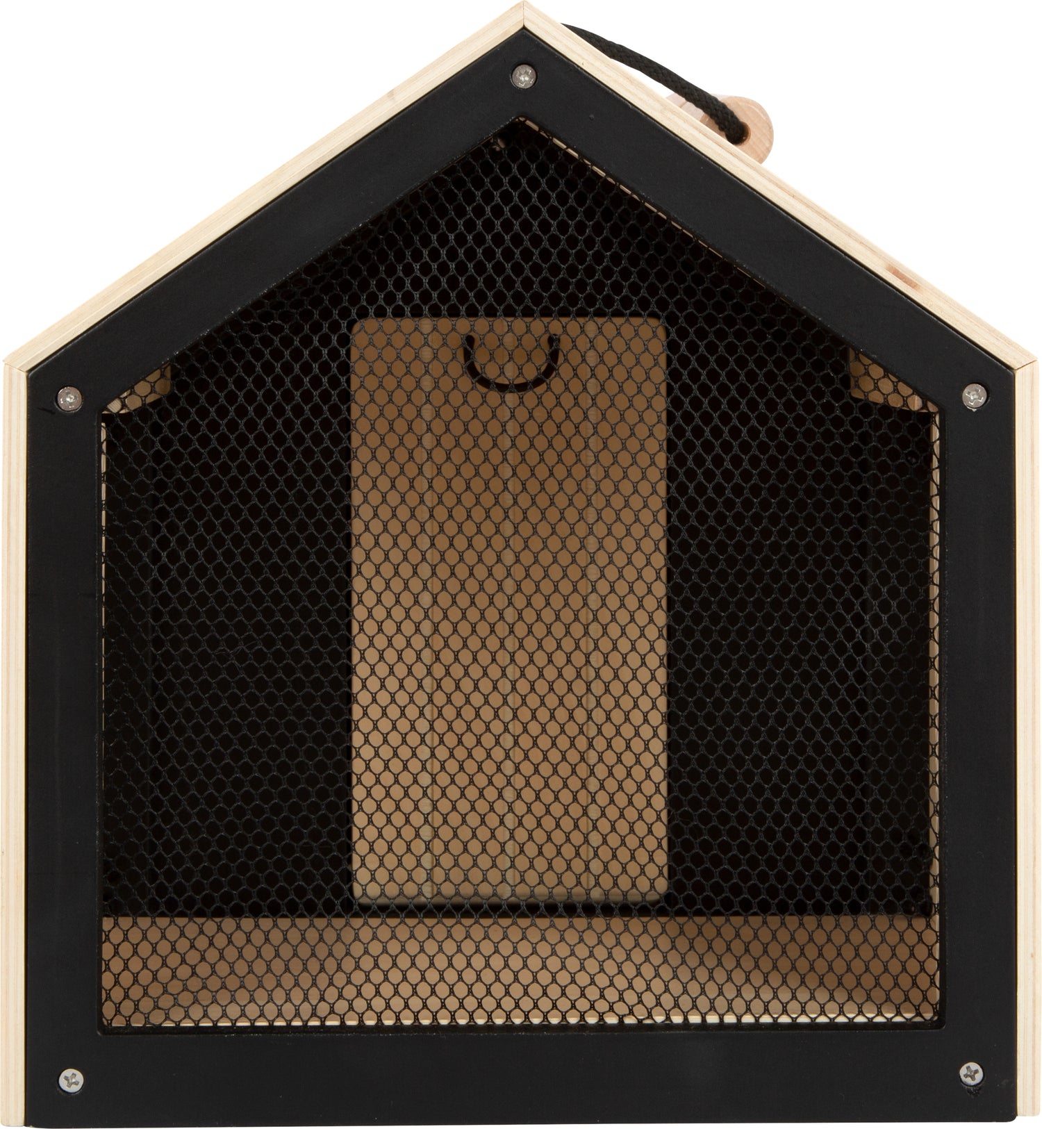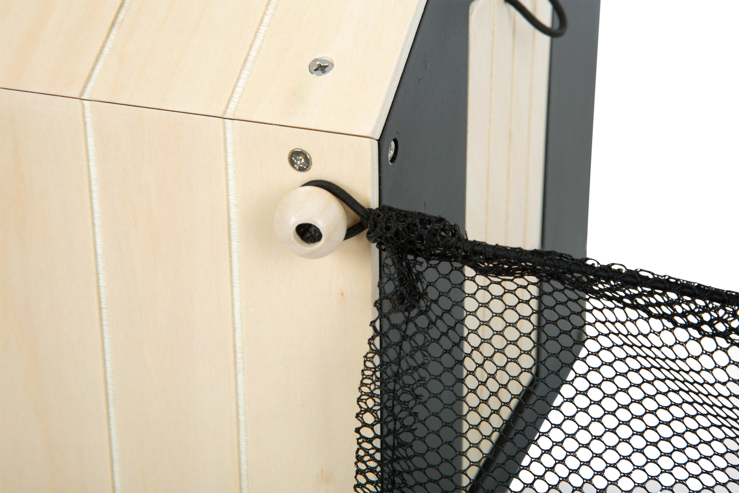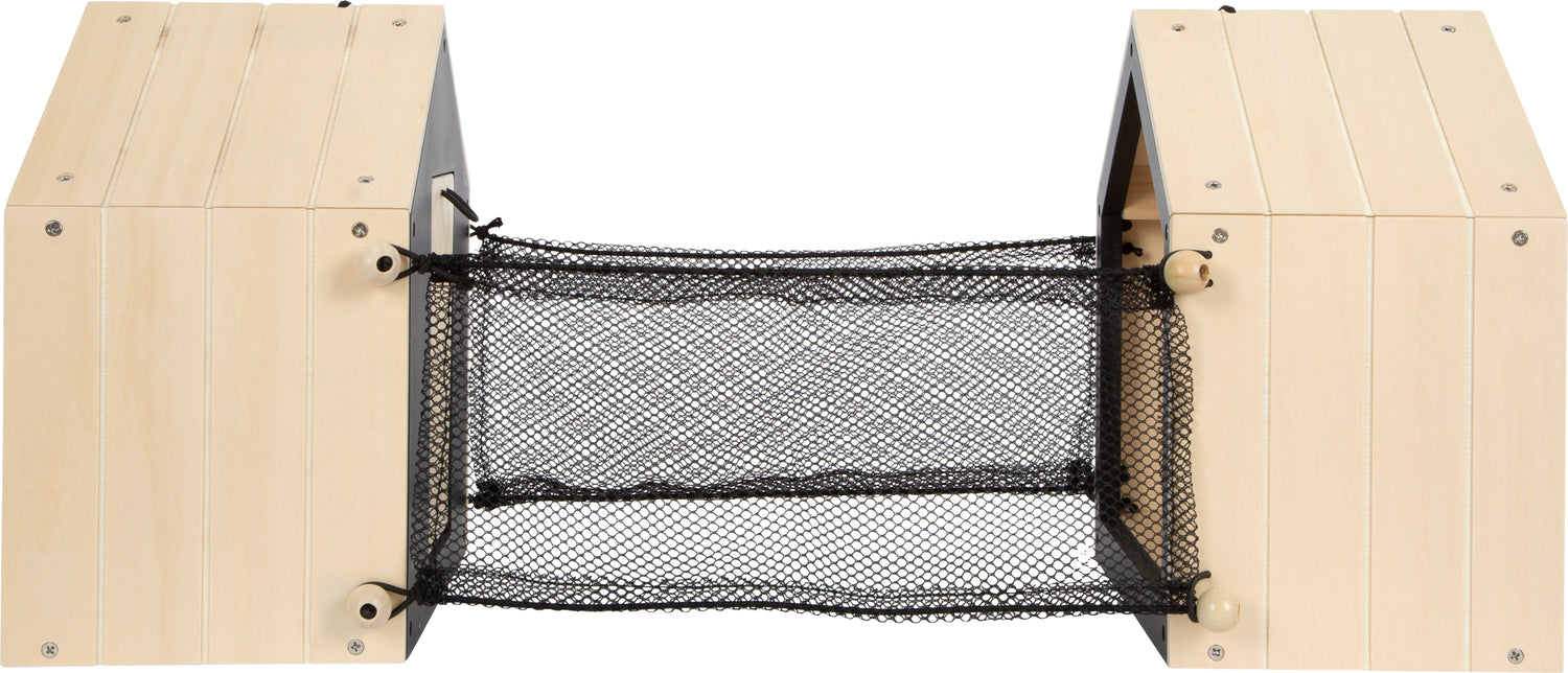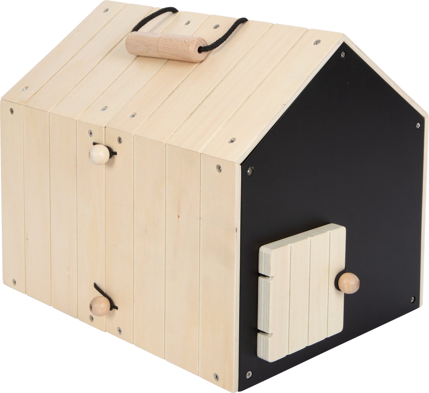 Die Doppelhütte von small foot aus stabilem Holz, die auch als Transportkäfig genutzt werden kann, besteht aus zwei mit Kugeln und Schlingen zusammenknüpfbaren Häuschen.