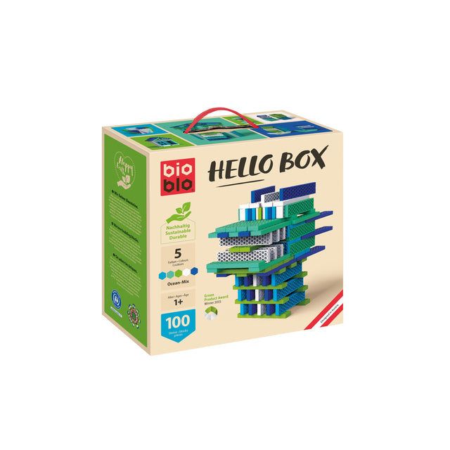 Die Hello Box Ocean Mix mit 100 Bioblo Bausteinen ist ein ideales Spielzeug für Kinder, um ihre Baufähigkeiten zu entwickeln und stundenlangen Spielspaß zu erleben.