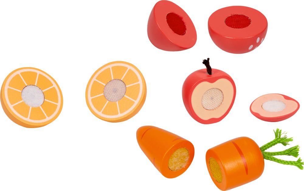 Das Holz-Schneide-Set Obst & Gemüse von "Die Lieben Sieben" von Coppenrath besteht aus verschiedenen Früchten, die miteinander durch Klettverschlüsse verbunden sind.
