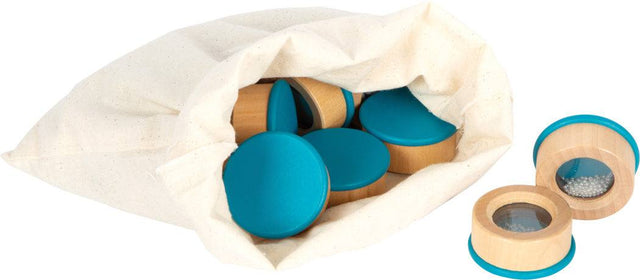 Die 16 Holzdosen sind mit verschiedenen Materialien wie Holzkugeln, Metallkügelchen, Kunststoffperlen oder Holztalern gefüllt, die beim Schütteln der Dosen unterschiedliche Klänge erzeugen.