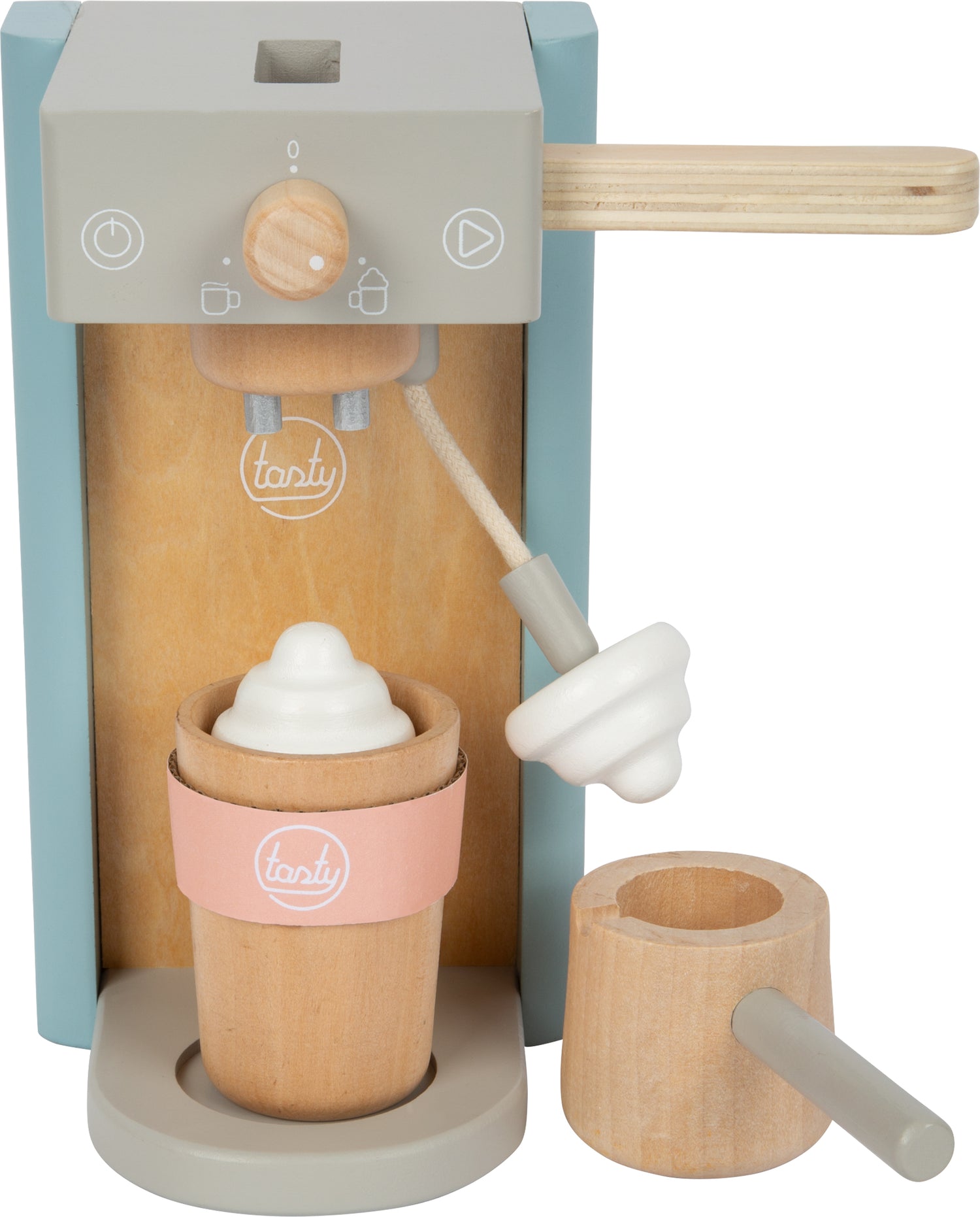 Die Kaffeemaschine von small foot sollte in keinem Kinderzimmer fehlen. Dieses Komplett-Set aus Holz umfasst neben der modernen Kaffeemaschine zwei Kaffeecoins und 2 Coffee-to-go-Becher, eine Zuckerdose mit Deckel/Löffel sowie ein Milchkännchen mit Milchschaumhauben. Für realistischen Spielspaß sorgen die Kaffeecoins, die in die Becher fallen und mit dem magnetischen Milchschaum stilecht verziert werden! Die Kaffeemaschine kann oben mit einem Kaffeecoin bestückt werden, der beim Betätigen des Hebels durch den Schlitz in den Becher fällt. Die konische Form der Kaffeecoins sorgt dafür, dass der Coin immer waagerecht in den Becher fällt. Der magnetische Milchschaum kann mit dem Milchkännchen abgenommen und auf die Becher umgefüllt werden. Der 'Milchschaumschlauch' ist ein mit Stoff ummantelter, in alle Richtungen biegsamer Draht, an dessen Ende per Magnet ein Milchschaumhäubchen befestigt wird. die Kaffeemaschine ist eine tolle Ergänzung für die Kinderspielküche. Hier sind der Fantasie keine Grenzen gesetzt. Artikelnummer: 12247 Altersempfehlung: ab 3 Jahren Maße: Kaffeemaschine ca. 16 x 11 x 19 cm Kaffeebecher Höhe: ca. 8 cm, Ø ca. 4,5 cm
