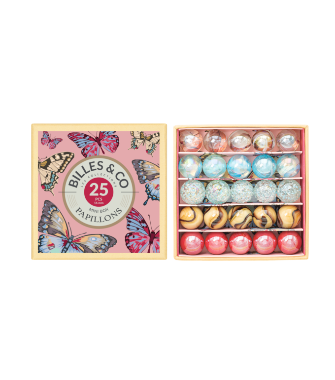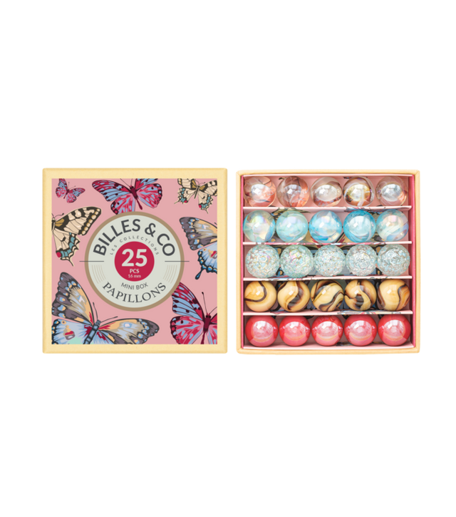 Die Billes & Co Murmeln Minibox "Anamorphic Butterfly" ist ein wahres Schmuckstück und enthält 25 süße Murmeln.