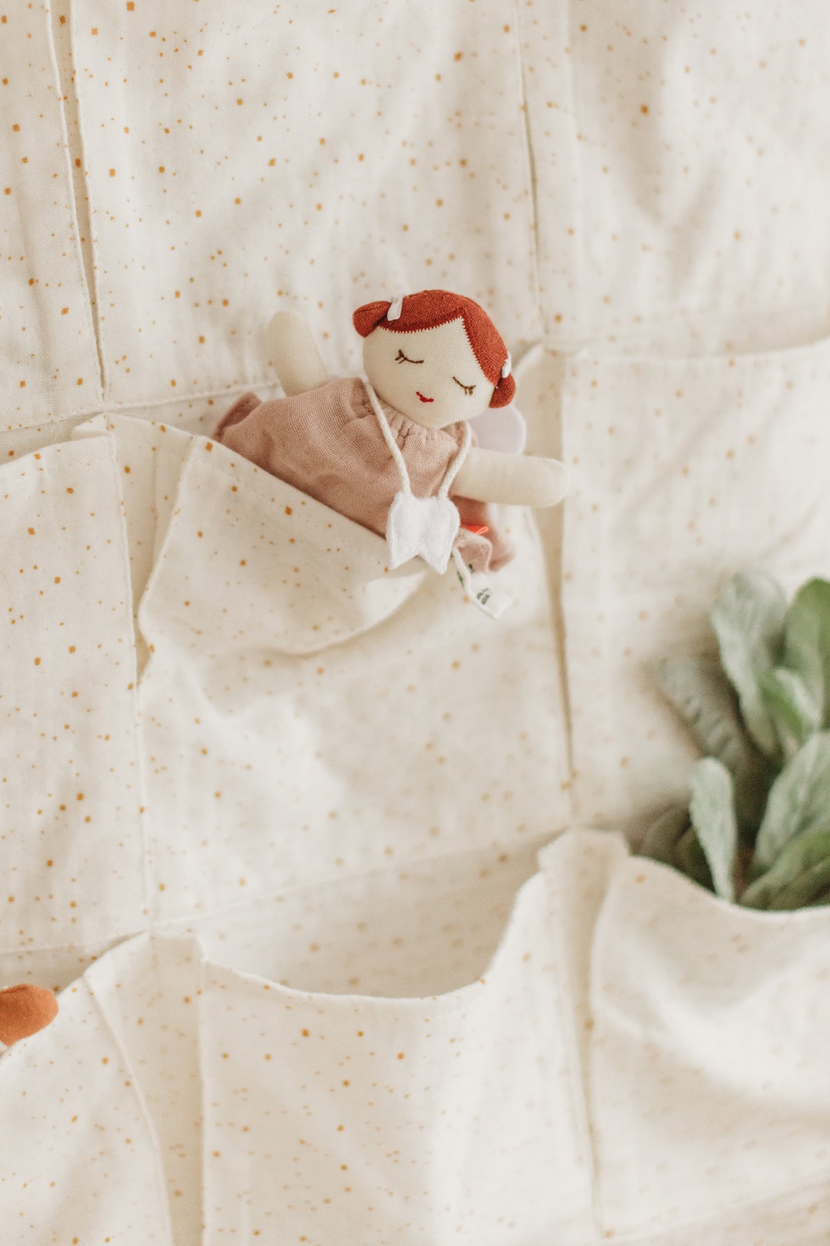 Bezaubernde kleine Zahnfee mit kleinem Beutelchen in Form eines Zahns für die Zähne. Die Zahnfee bewahrt Kindheitserinnerungen mit jedem Zahn, den sie sammelt. Dazu ist sie kuschelweich, eine wunderbarer Freundin und Seelentrösterin. Mit ihr kann man richtig spielen, sie an- und ausziehen. Stoffpuppe Zahnfee ist aus GOTS zertifizierte Bio Baumwolle und innen mit weichen recycelten Polyesterfasern gefüllt. Auch als große Puppe erhältlich. Maße: 14x12x2,5cm. Altersempfehlung: Ab Geburt. Pflege: Bei 30 Grad waschen.