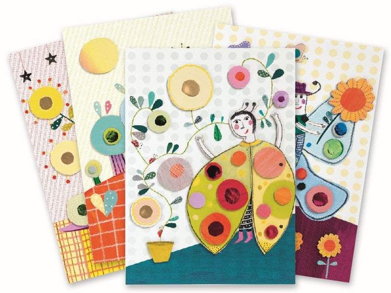 Der Kasten enthält 4 Vorlagen, die die Kinder vervollständigen können, sowie 4 Päckchen mit verschiedenen Bastel-Utensilien wie Augen, Knöpfe, Sternchen und mehr.