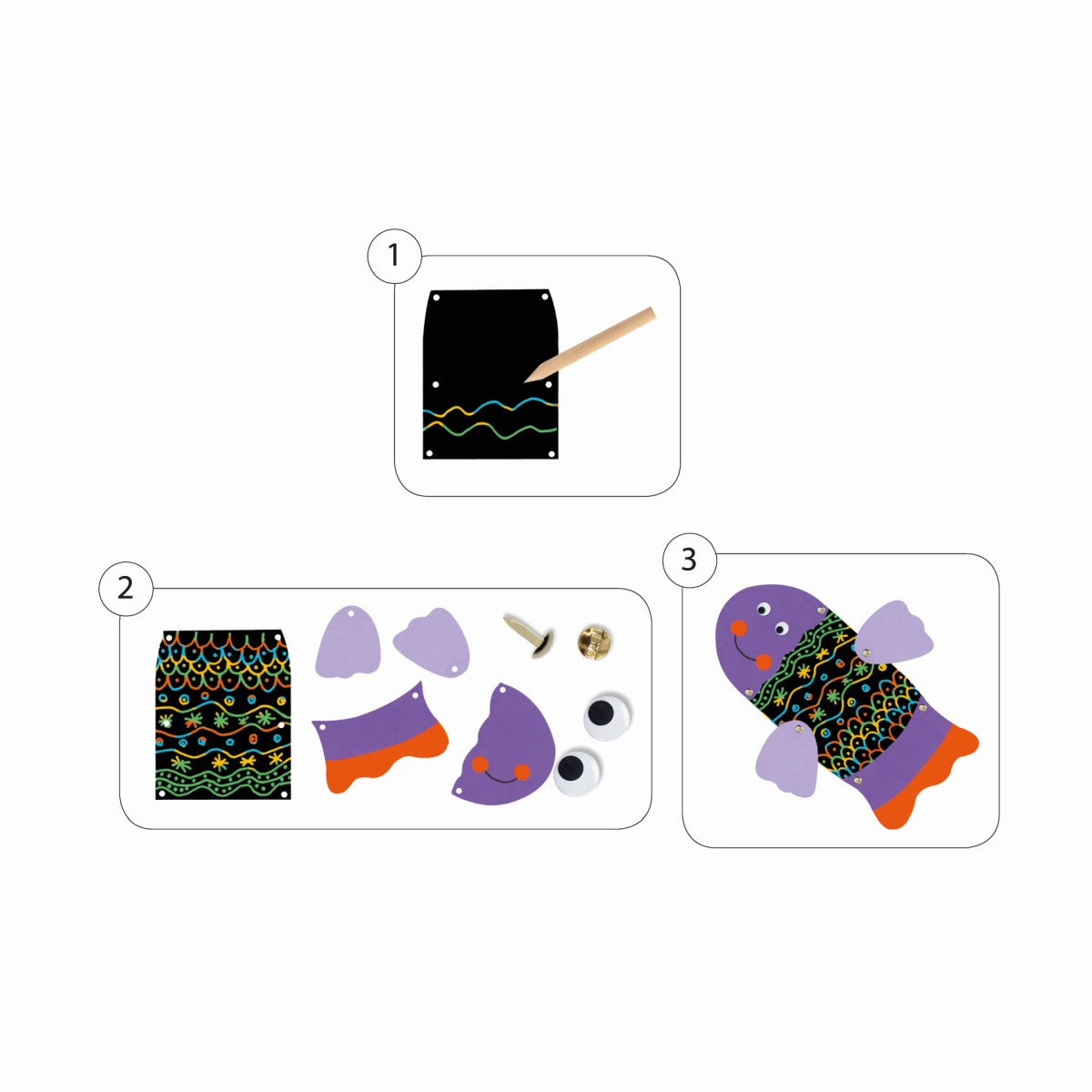 Wie durch zauberhand erscheinen bei den tollen Kratzbildern „lustige Tiere“ DJ09094 von Djeco wunderbare Bilder – ganz einfach durch kratzen mit dem Holzstift.