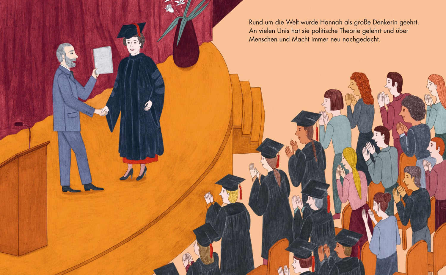 Little People, Big Dreams erzählt von den beeindruckenden Lebensgeschichten großer Persönlichkeiten: Jede dieser Frauen, ob Künstlerin, Pilotin oder Wissenschaftlerin, hat Unvorstellbares erreicht. Dabei begann alles, als sie noch klein waren mit großen Träumen. Hannah war eine brillante Philosophiestudentin. Als Jüdin musste sie Deutschland in den dreißiger Jahren verlassen, sie wanderte in die USA aus. Dort arbeitete sie als Journalistin und Hochschullehrerin. In ihren radikalen Büchern über Macht und Gewalt setzt sie sich für die Freiheit und Gleichheit aller Menschen ein und veränderte damit die Philosophie.