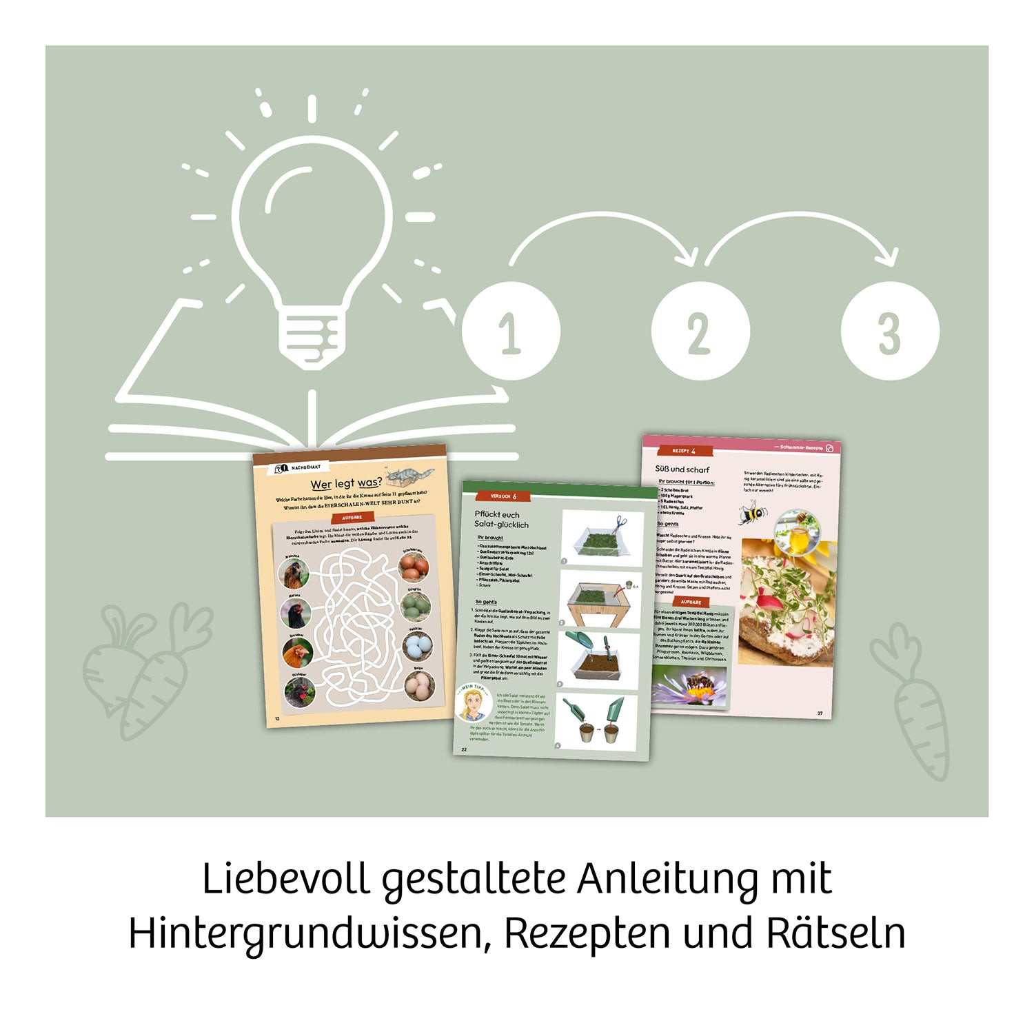 Saatgut Kresse, Saatgut Pflücksalat, Saatgut Tomate, Saatgut Radieschen, farbig illustrierte Anleitung