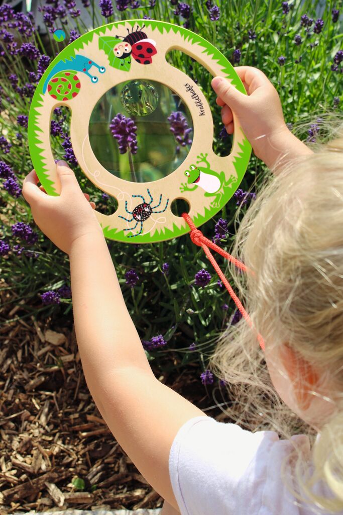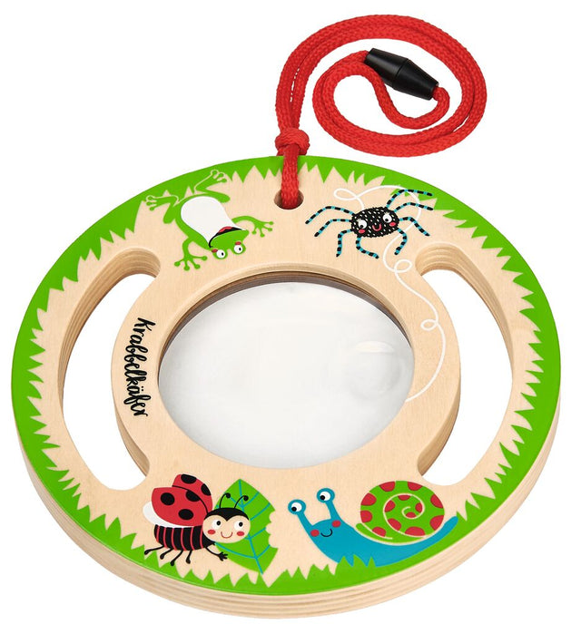 Das perfekte Geschenk für kleine Abenteurer und wissbegierige Forscher*innen! Die große Krabbelkäfer-Lupe XXL hilft kleinen Entdecker*innen dabei, alle Details von Blättern, Blumen, Tierchen oder Alltagsgegenständen zu bestaunen. Das niedliche Krabbelkäfer-Design der Lupe macht sofort gute Laune und passt thematisch ideal zur Entdeckungstour in Wald, Wiesen oder dem heimischen Garten. Das große Lupenglas ermöglicht eine 2-fache Vergrößerung, die kleine Detaillupe darin lässt Dinge sogar 4-fach größer erscheinen. So werden selbst winzige Einzelheiten sichtbar. Dank der beiden praktischen Griffe aus Holz, die ideal für kleine Kinderhände geeignet sind, lässt sich die Lupe ganz einfach greifen und sicher festhalten. Für extra Sicherheit sorgt außerdem das praktische Umhängeband mit Sicherheitsverschluss. Einfach umhängen und schon kann die Lupe überall mit hingenommen werden ohne verloren zu gehen. Ein Muss für die Kleinsten, die nach und nach die Welt um sich herum entdecken!