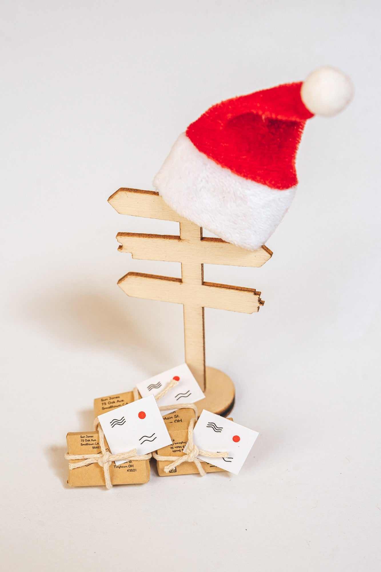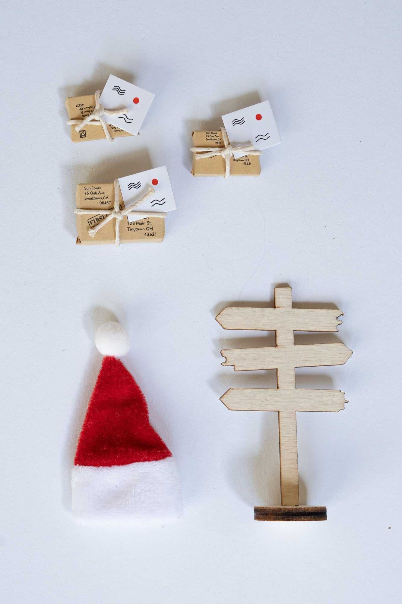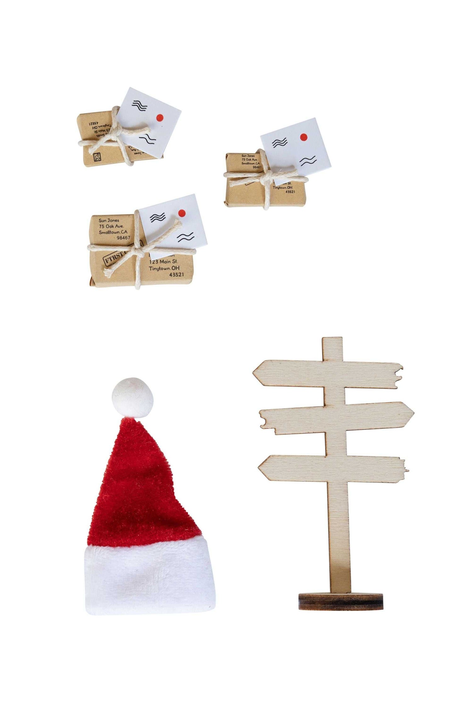 Das Set beinhaltet: Nikolausmütze 2 Stück ca. 7 x 11 cm/ Pakete 6 Stück ca. 15-30mm/ Wegweiser ca.8 x 4,5 cm