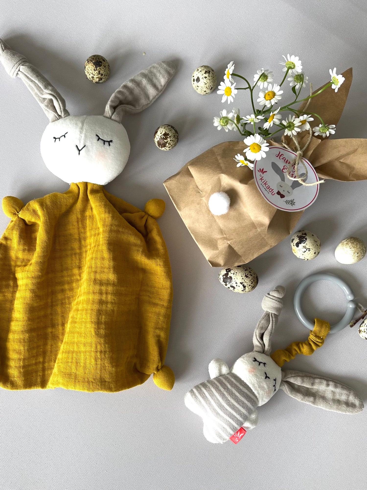 In diesem liebevoll verpackten Osterhäschen-Set befindet sich ein Schmuestuch und ein Minimobile mit Pfeifer.