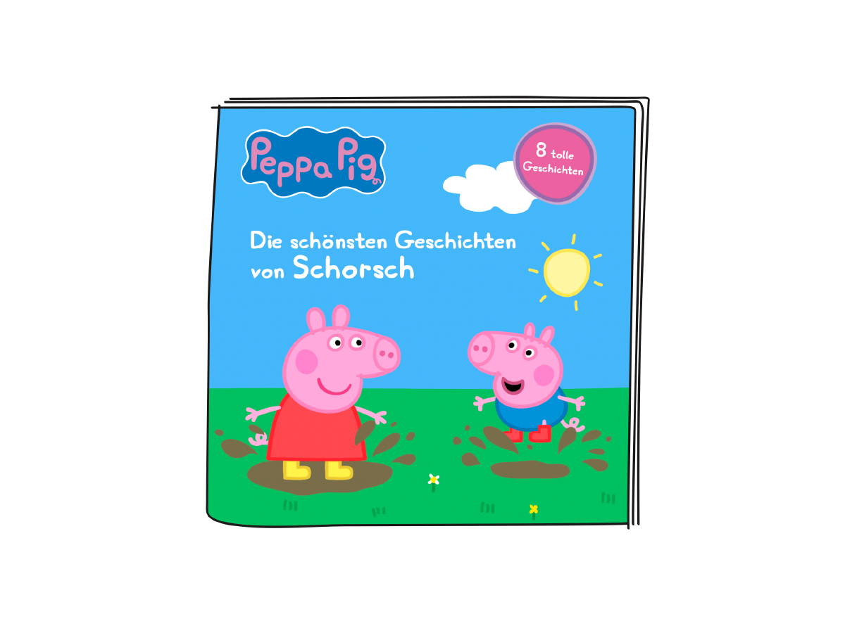 ""Hörfigur für die Toniebox: Kurze Geschichten für große Schweinchen-Fans – Peppa und ihre Familie und Freunde kommen auf die Toniebox! Sie ist klein, pink und liebt Matschepfützen über alles: Peppa Wutz begeistert mit ihren kurzen Geschichten schon die kleinsten Hörspielfans. Und jetzt kommt ihr kleiner Bruder Schorsch. Erlebt mit ihm und Peppa tolle Abenteuer: es geht zu Opi Mümmels Leuchtturm, zu Edmund Elefants Geburtstagsparty oder ins aufregende Mini-Land– stell Schorsch einfach auf deine Toniebox und begleite ihn und seine Familie und Freunde auf 8 lustigen Abenteuern. 1. Baby Alexander Peppas Cousine und Cousin kommen zu Besuch. Doch mit Baby Alexander ist zu klein und kann noch nicht sprechen. Bis Peppa ihm sein erstes Wort beibringt. 2. Champion Pappa Wutz Als Papa seinen Titel als Champion im Matschpfützenspringen verliert, ist er sehr traurig. Bis ihm alle dabei helfen, den Titel zurückzuholen. 3. Schakka-Lakka-Bumm Madame Gazelle bringt Instrumente mit in die Spielgruppe, damit die Kinder musizieren können. Die Instrumente machen „schakka und „lakka und „bumm! 4. Der Laster von Herrn Fuchs Herr Fuchs bringt Freddie zu Peppa, damit die Kinder Fahrrad fahren können. Und alle Kinder versuchen zu erraten, was Herr Fuchs wohl alles in seinem großen Laster haben könnte! 5. Sonne, Strand und Schnee Peppa, ihre Freunde und ihre Familie freuen sich auf einen Ausflug zum Meer. Aber als sie dort ankommen, liegt am Strand Schnee! 6. Opi Mümmels Leuchtturm Opa Wutz nimmt Peppa, Schorsch und Klausi Kläff mit auf einen Auszuflug zu Opi und seinem Leuchtturm. 7. Edmund Elefant feiert Geburtstag Peppa und ihre Freunde helfen bei der Geburtstagsparty von Edmund Elefant, aber das ist schwieriger, als sie gedacht hatten... 8. Das Mini-Land Es ist Zeit für einen Tagesausflug und Peppa, George, Mama Wutz, Papa Wutz und Luzie Locke besuchen das Mini-Land. Sie sehen winzige Dinosaurier, ihre liebsten winzigen Wahrzeichen und sogar ein kleines Fräulein Löffel! ""
