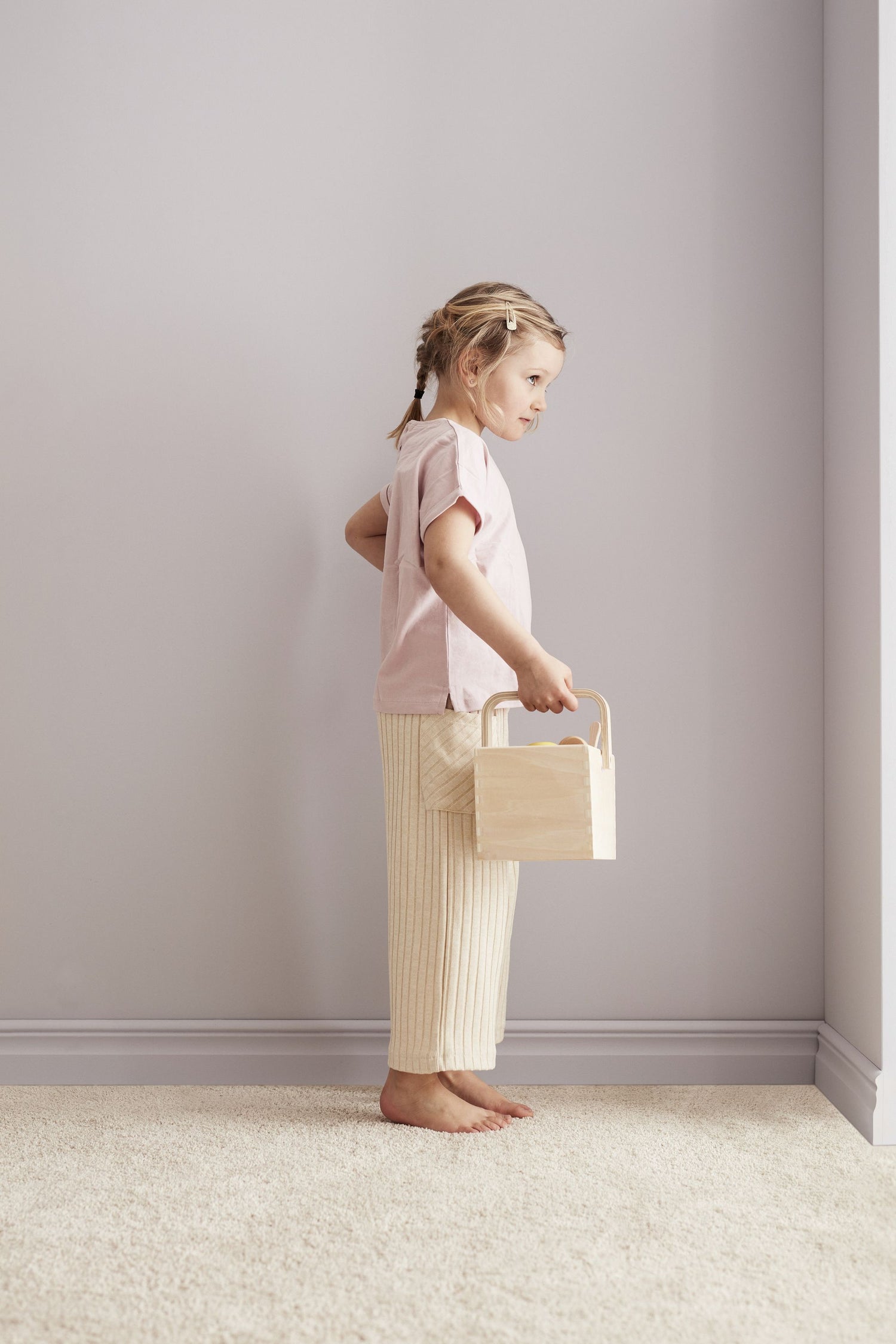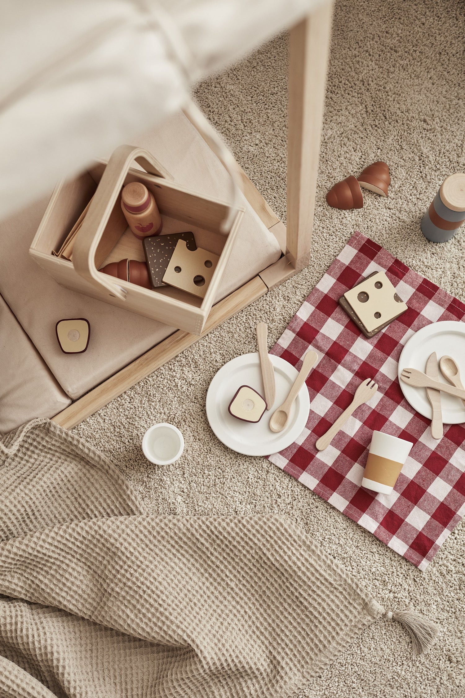 Süßes Picknick-Set aus Holz von Kids Concept. So können die Kleinen jederzeit und überall ein kleines Picknick genießen. In diesem Set ist alles enthalten, was sie dafür benötigen. Teller, Besteck und Tassen. Auch das Essen und Trinken wie Kaffee, Himbeerlimonade, Roggenbrot oder ein Sandwich mit Käse oder ein Croissant und Früchte sind vorhanden. Apfel und Croissants sind mit Klettverschlüssen ausgestattet, sodass sie sich teilen lassen. Die Thermoskanne und die Limonadenflasche haben abnehmbare Verschlüsse, um das Spiel noch realistischer zu gestalten. Eine Picknickdecke ist ebenfalls vorhanden und der Korb kann auch als Einkaufskorb verwendet werden.