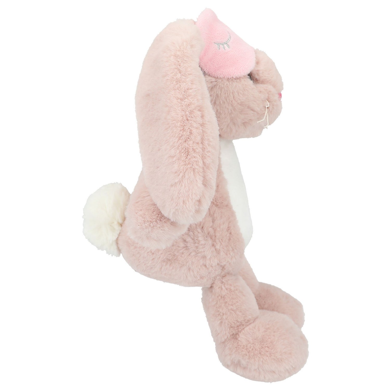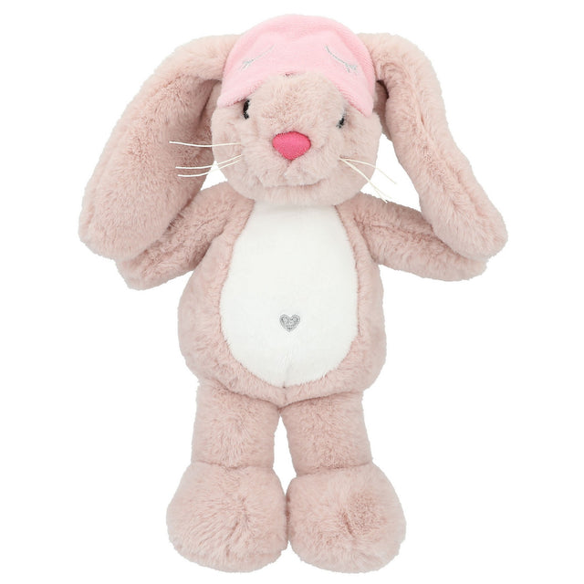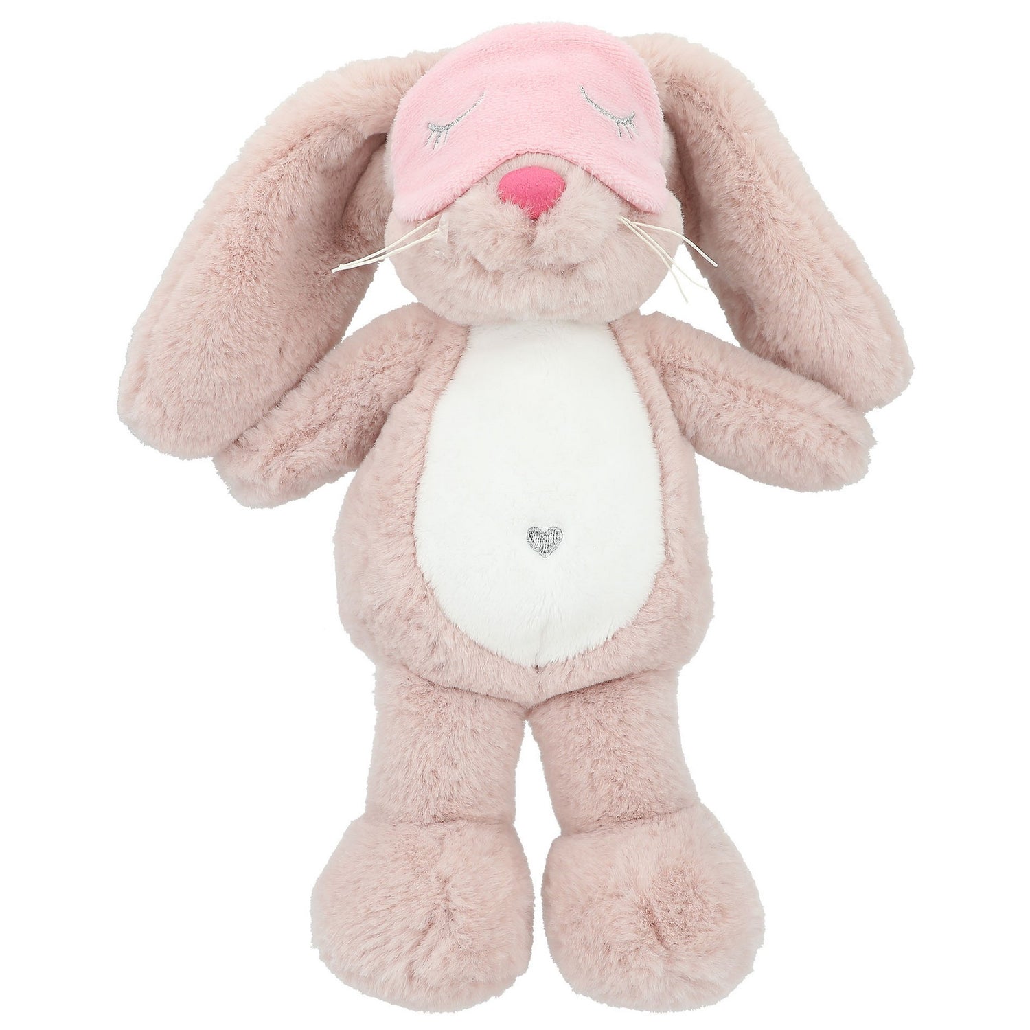 Nelly trägt eine pinke Schlafmaske mit gestickten Schlafaugen. Ein süßer Hase zum knuddeln und lieb haben.