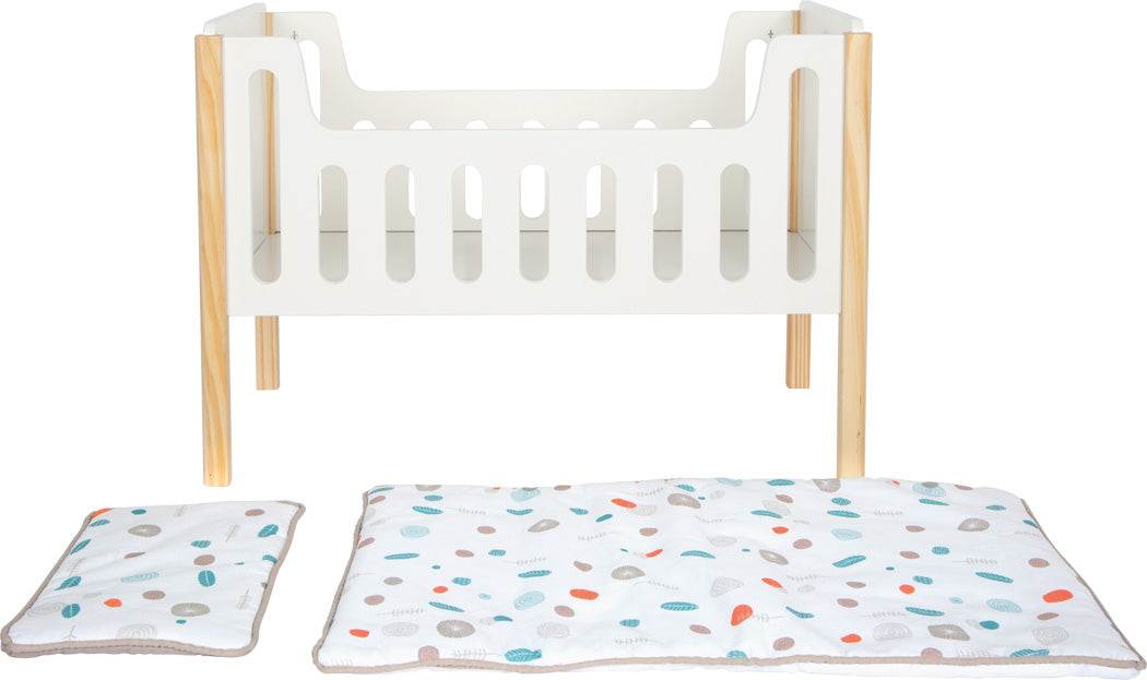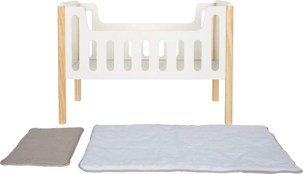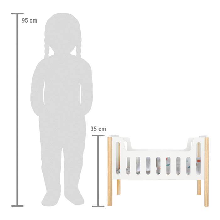 Dank seines dezenten Designs in neutralem Weiß in Kombination mit dem naturbelassenen Holz fügt sich dieses stabile Puppenbett harmonisch in jede Wohn- oder Kinderzimmereinrichtung ein.