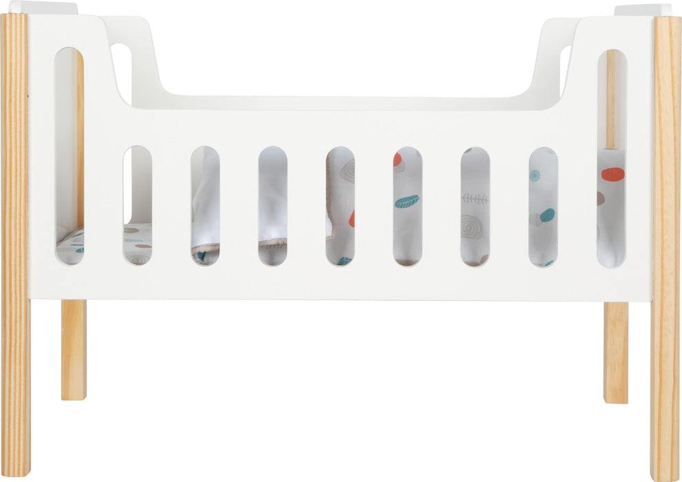 Die hochwertige Verarbeitung mit abgerundeten Kanten und sichtbaren Vollholzelementen verleiht dem Puppenbett eine stilvolle Ergänzung für das Puppenspiel.