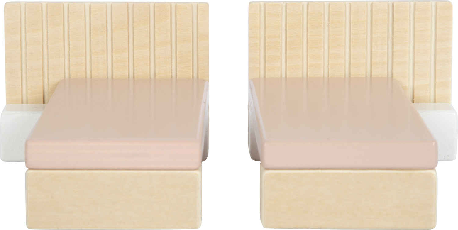 Im Zentrum des Sets stehen zwei Betten, die sowohl als Doppelbett als auch als Einzelbetten verwendet werden können.
