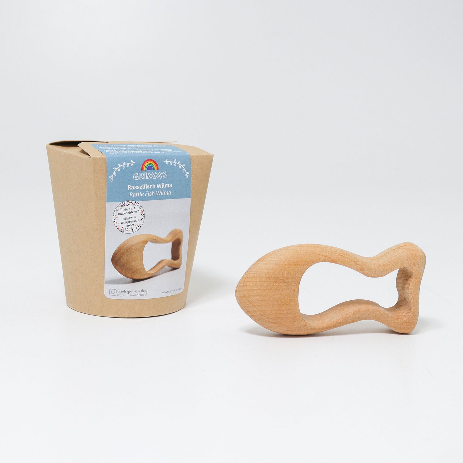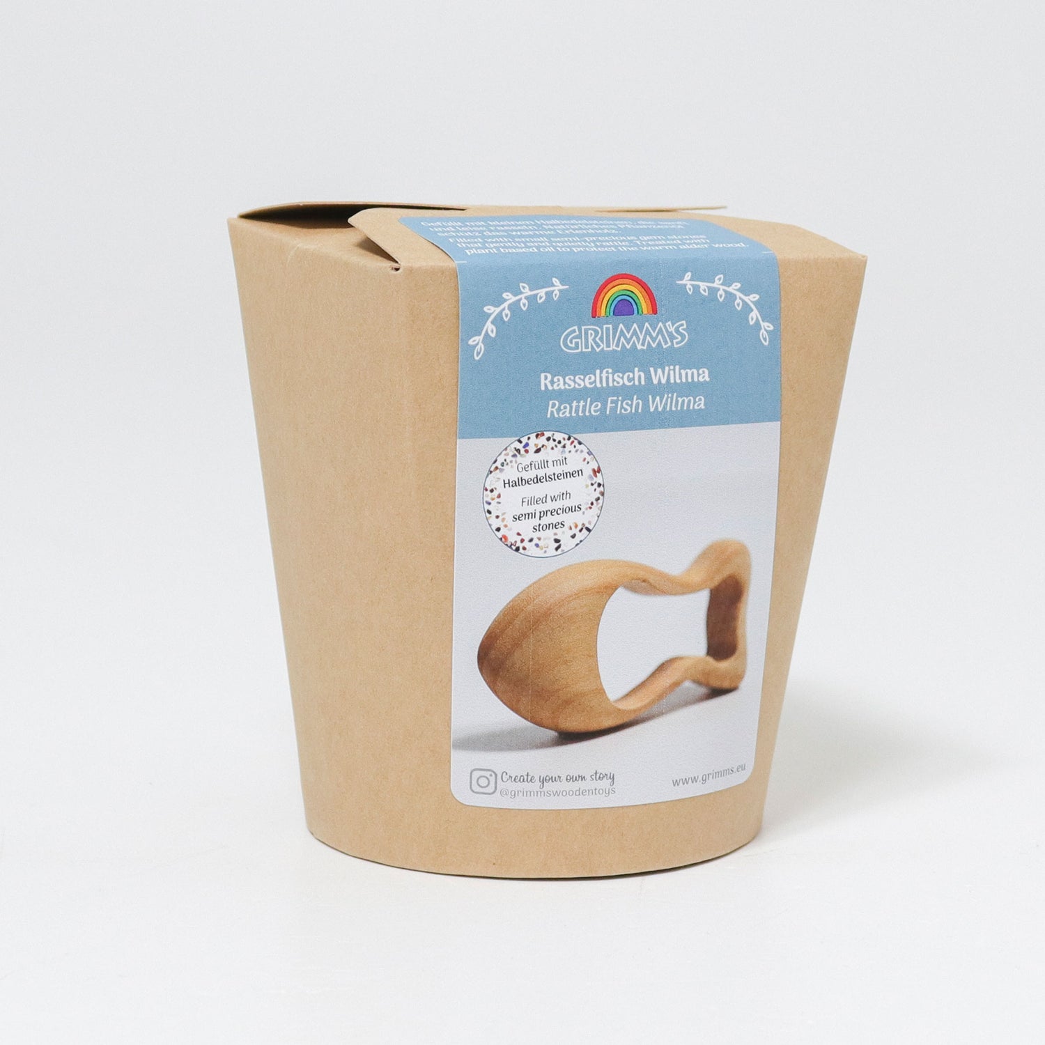 Der Rasselfisch Wilma von Grimms ist mit Halbedelsteinen gefüllt und wird Ihr Baby begeistern.