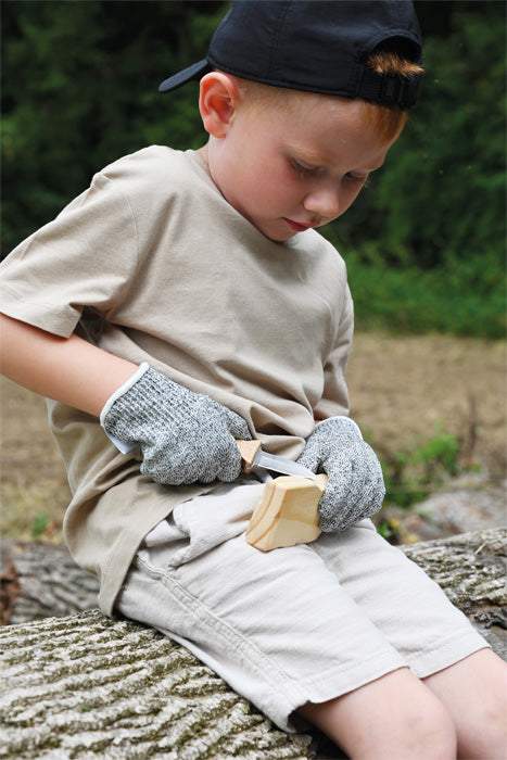 Textilscheide mit Klettverschluss und Gürtellasche aufbewahrt. Das Set wird durch spezielle Schnittschutzhandschuhe in Kindergröße und einen Schnitzblock aus Holz ergänzt.