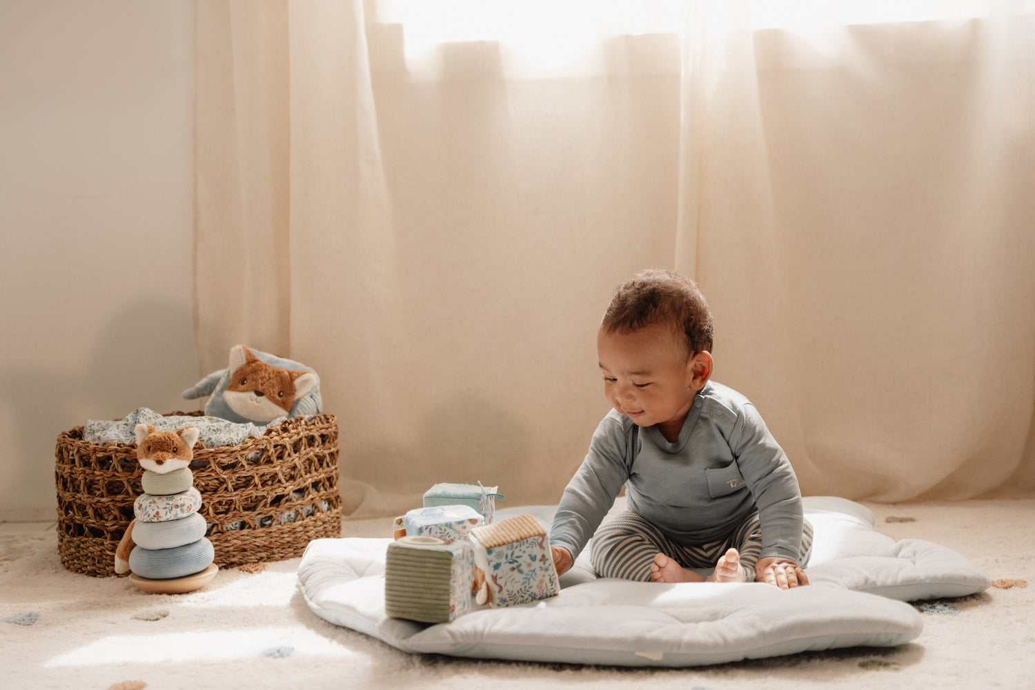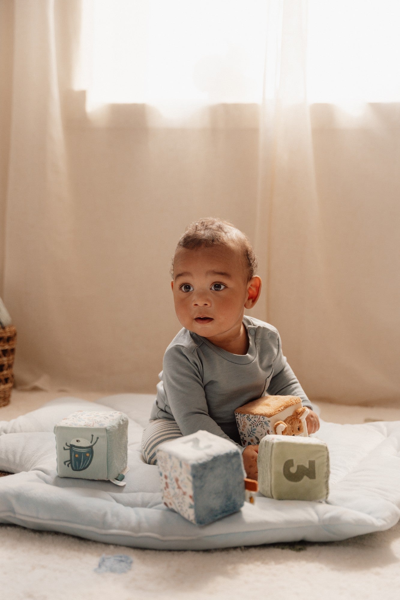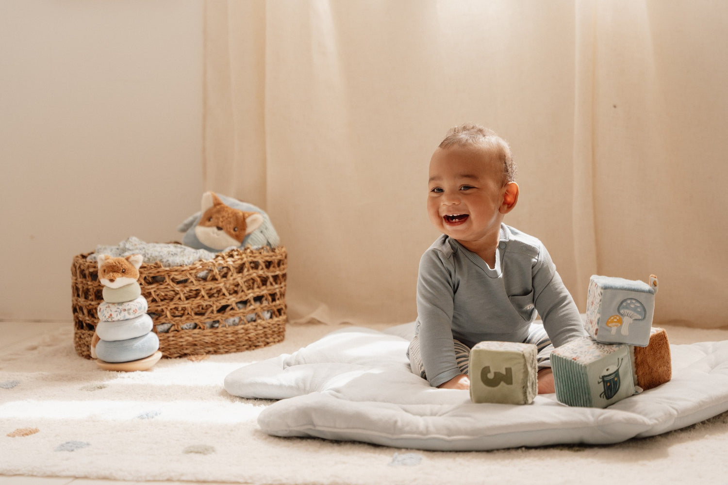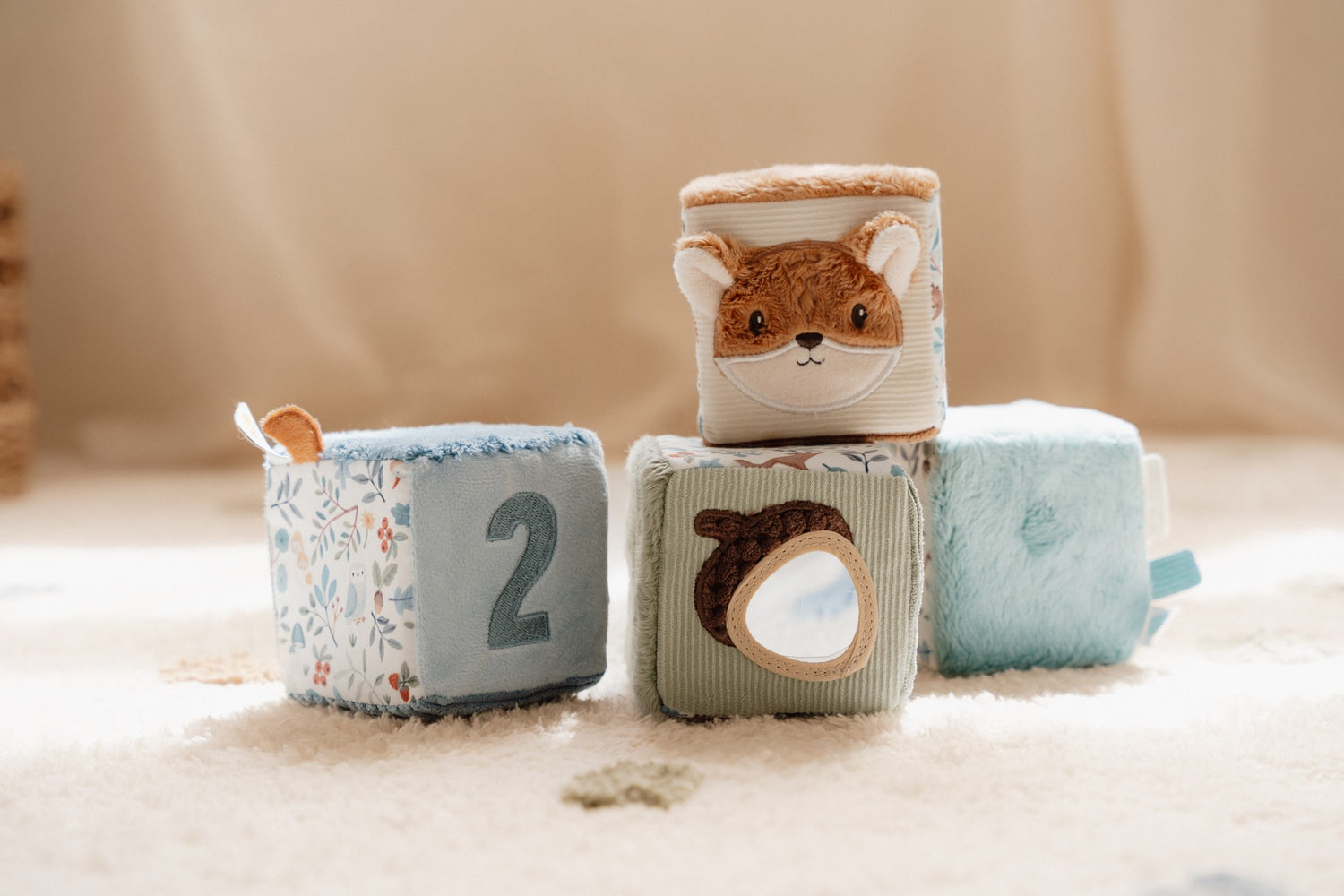 Das Little Dutch Stoffwürfel Set aus der Forest Friends-Kollektion ist ein unterhaltsames und lehrreiches Spielzeug für Babys ab 0 Monaten. Die vier weichen Aktivitätsblöcke bieten verschiedene Geräusche, Texturen und Funktionen, die die Sinne Ihres Kindes anregen und die Hand-Augen-Koordination fördern. Jeder Block ist durch sanfte Farben definiert und mit einer einzigartigen Nummer verziert, was es Ihrem Kind ermöglicht, spielerisch Zahlen und Farben zu erkunden. Die bezaubernden Etiketten, Plüschtafeln und der nussige Spiegel sorgen für zusätzliche sensorische Stimulation und fördern die taktile Entwicklung. Das Stoffwürfel Set ist nicht nur ein lustiges Spielzeug, sondern auch ein pädagogisches Werkzeug. Durch das Spielen mit den Blöcken können Babys ihre motorischen Fähigkeiten verbessern, ihre kognitiven Fähigkeiten entwickeln und ihre Neugier wecken. Die verschiedenen Geräusche und Texturen regen die Sinne an und helfen dabei, die Welt um sie herum zu entdecken. Das Set ist in der Farbe Blau gehalten und passt perfekt zur Forest Friends-Kollektion. Es ist leicht zu greifen und zu halten, sodass auch die feinmotorischen Fähigkeiten Ihres Kindes trainiert werden. Die hochwertige Verarbeitung und die weichen Materialien sorgen dafür, dass das Spielzeug sicher und langlebig ist. Insgesamt ist das Stoffwürfel Set Forest Friends ein vielseitiges und ansprechendes Spielzeug, das sowohl die Sinne als auch die Entwicklung Ihres Babys fördert. Es bietet stundenlangen Spielspaß und ist ein tolles Geschenk für kleine Entdecker. Gönnen Sie Ihrem Kind dieses einzigartige Spielzeug und sehen Sie, wie es seine Fähigkeiten und seine Fantasie entfaltet.