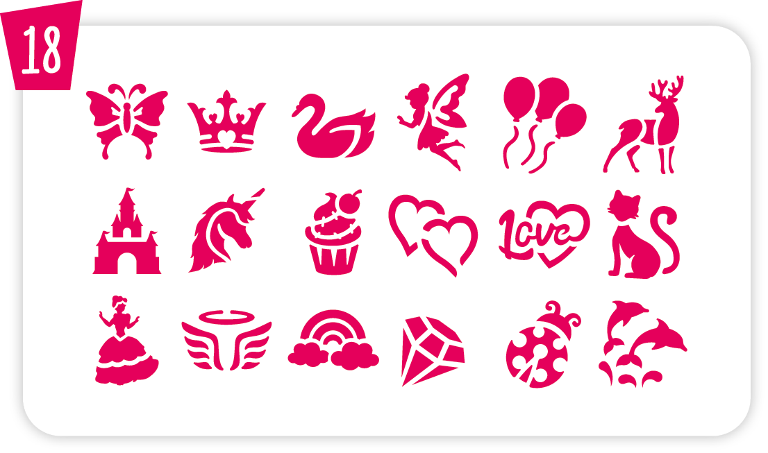 Im Set enthalten sind: 18 tolle Schablonen zum Aufkleben auf die Haut.