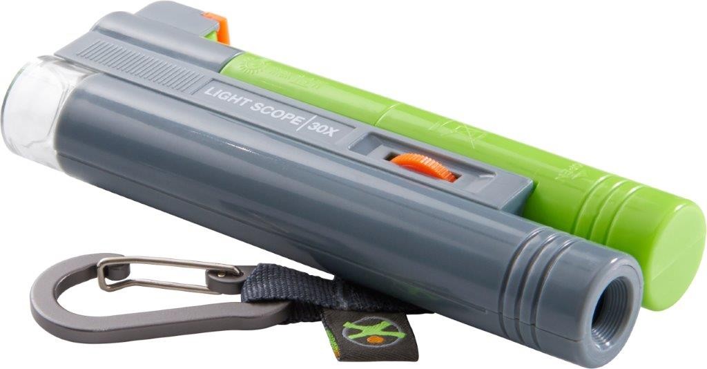 Mit dem praktischem Karabiner lässt sich das Mikroskop schnell und sicher an der Hose oder am Rucksack befestigen.