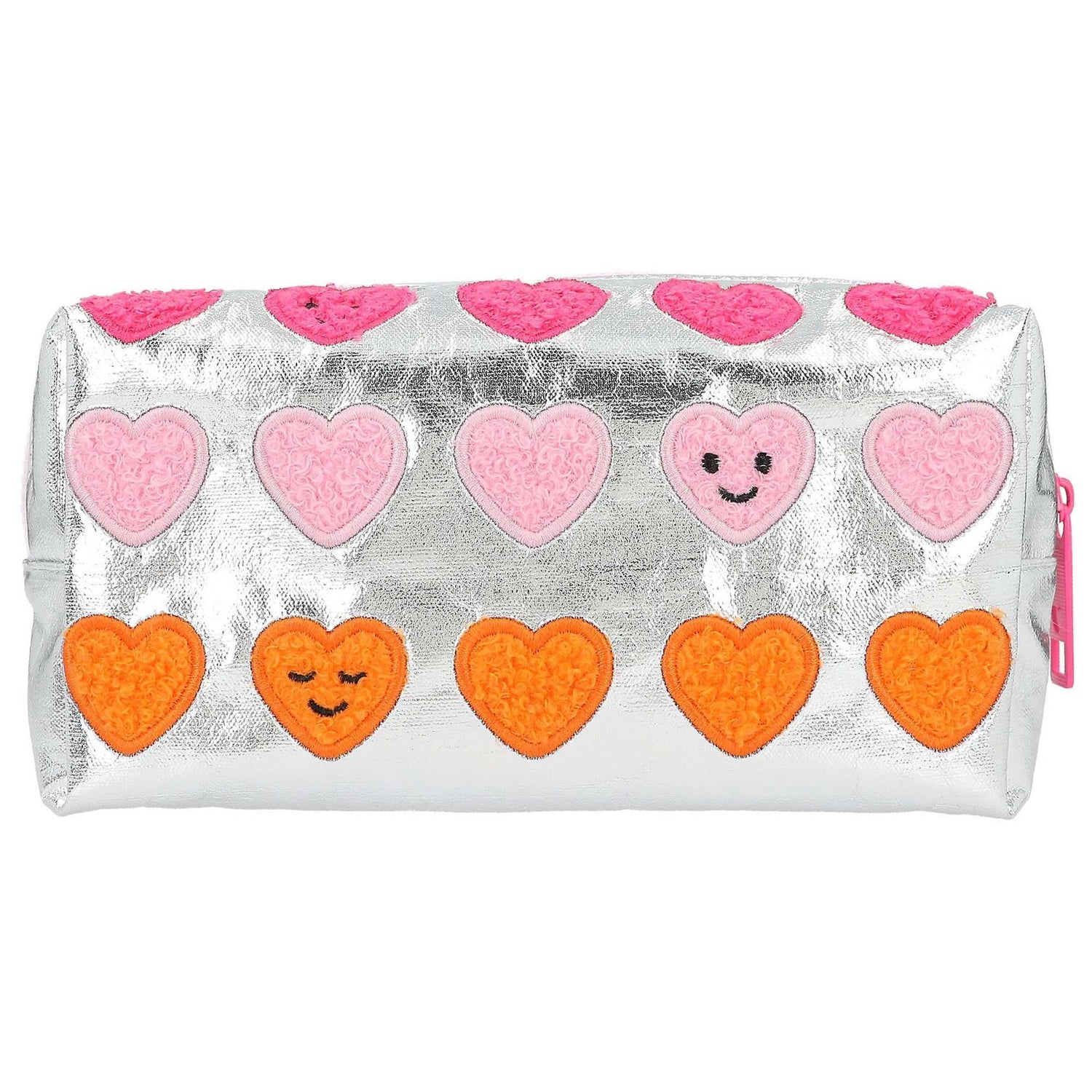 Die Kosmetiktasche hat geflockte Herzen in Pink, Rosa und Orange auf der einen Seite und einem großen Model-Motiv auf der anderen.