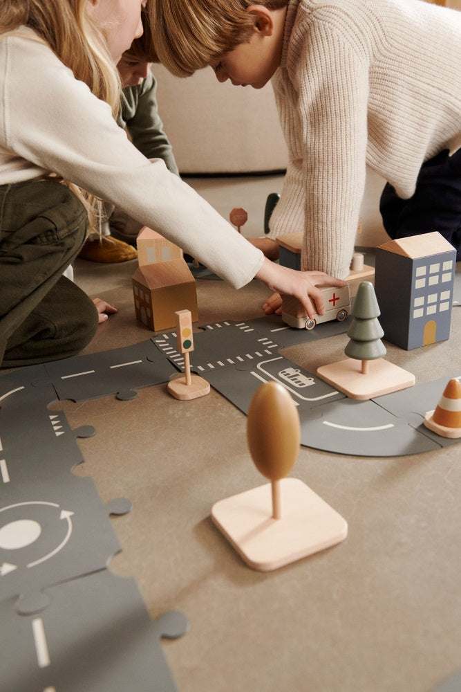 Hier können Sie Ihre eigene fantastische Welt gestalten, voller Straßen, Fahrzeuge, Bäume und Häuser aus langlebigem Buchenholz.