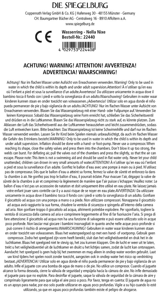 ACHTUNG! Nur im flachen Wasser unter Aufsicht von Erwachsenen verwenden. Blasen Sie das Wasserspielzeug mit einer Hand- oder Fußpumpe auf.
