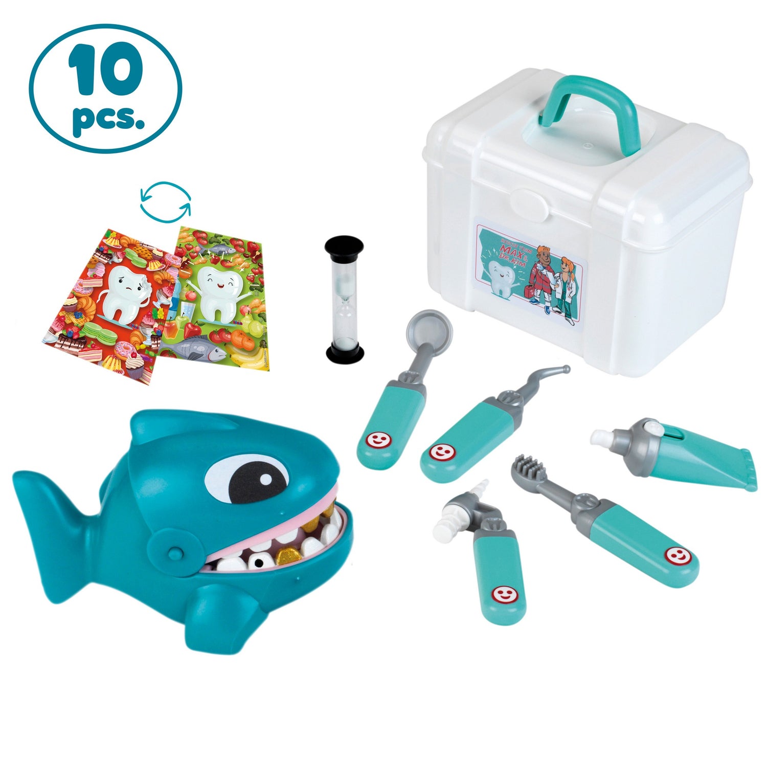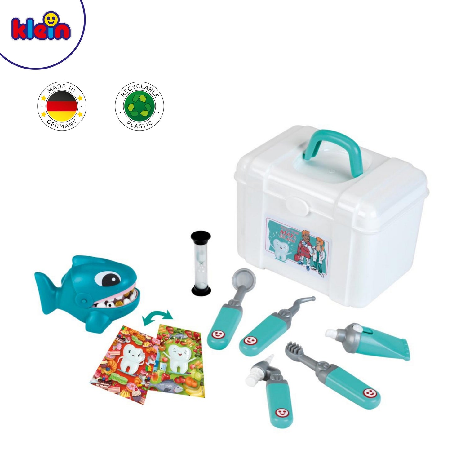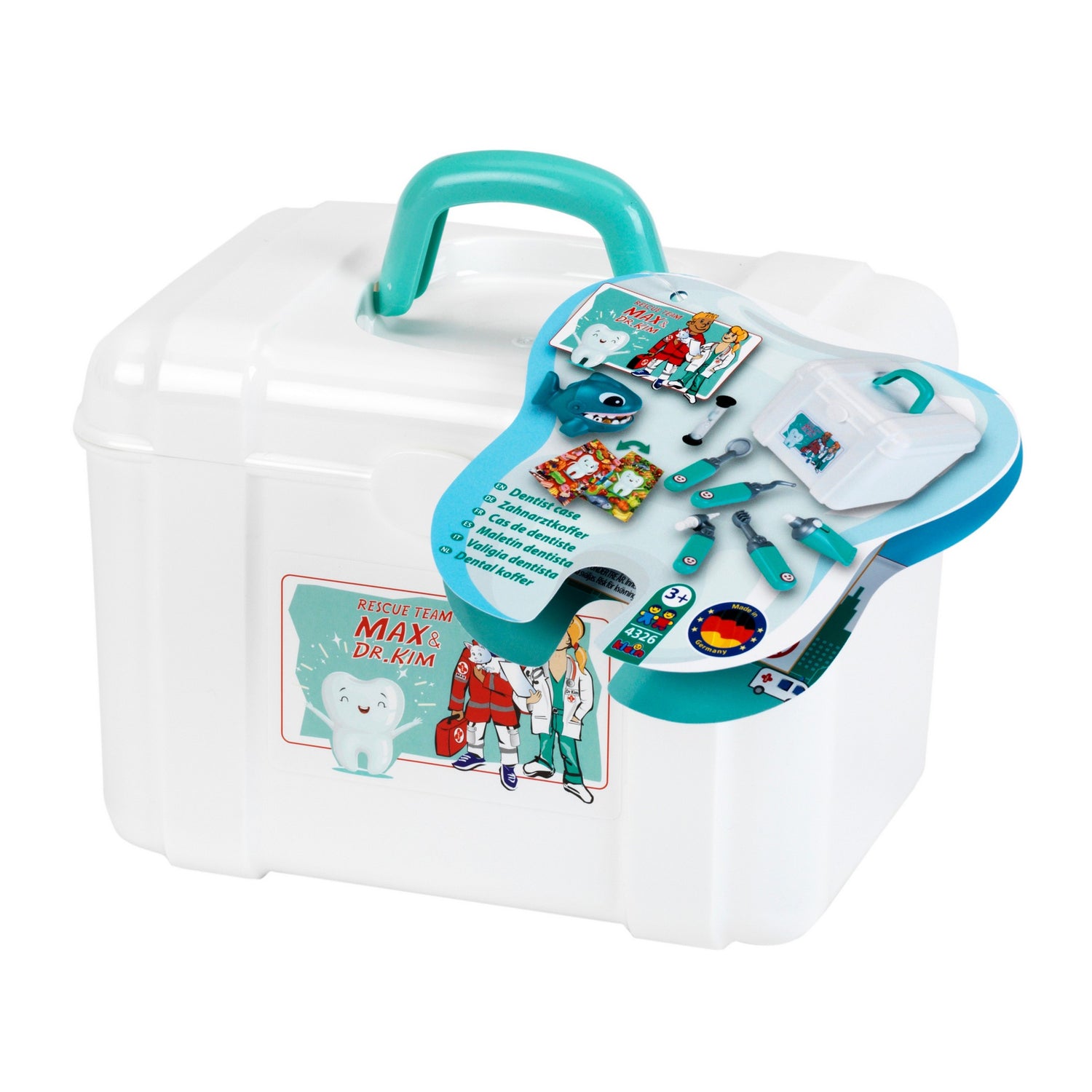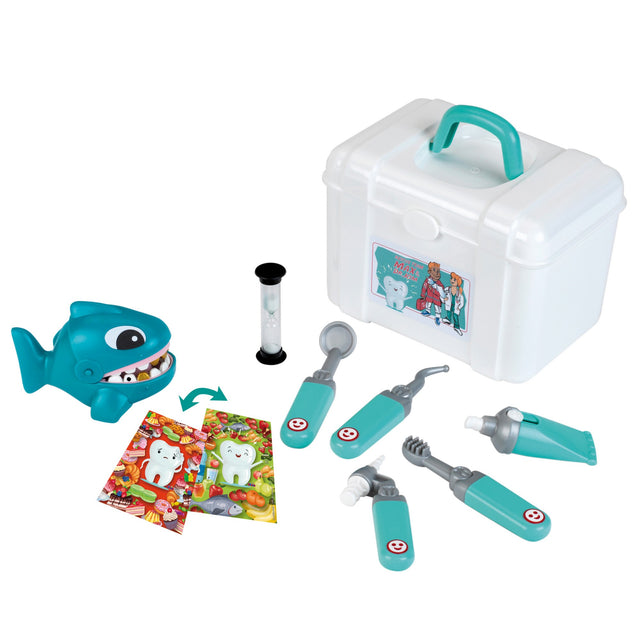 Der Zahnarztkoffer ist ein pädagogisches Spielzeug, das Kindern ermöglicht, spielerisch den Beruf des Zahnarztes kennenzulernen. Mit diesem Koffer können Kinder die Zähne eines kleinen Haifisches gründlich untersuchen und behandeln. Der Koffer ist robust und mit verschiedenen Zahnarztinstrumenten wie einem Bohrer, einem Spiegel, einer Spritze und vielem mehr ausgestattet. Ein lustiges Extra ist der kleine Hai, dessen Zähne auf einer Seite gesund sind, auf der anderen Seite jedoch kaputt und dringend behandelt werden müssen. Dies bietet den Kindern die Möglichkeit, sich in die Rolle des Zahnarztes zu versetzen und spielerisch zu lernen, wie wichtig die Zahngesundheit ist. Der Zahnarztkoffer ist ein ideales Spielzeug, um Kindern die Angst vor dem Besuch in der Zahnarztpraxis zu nehmen. Durch das spielerische Erleben können Kinder Vertrauen aufbauen und lernen, dass der Zahnarztbesuch gar nicht so schlimm ist. Der Koffer wurde in Deutschland hergestellt und hat die Maße 21 cm x 14,5 cm x 13 cm. Er ist für Kinder ab drei Jahren geeignet und bietet stundenlangen Spielspaß. Mit dem Zahnarztkoffer können Kinder nicht nur ihre Feinmotorik und Hand-Augen-Koordination verbessern, sondern auch Verantwortungsbewusstsein und Empathie entwickeln. Insgesamt ist der Zahnarztkoffer ein hochwertiges und pädagogisch wertvolles Spielzeug, das Kindern nicht nur Spaß macht, sondern auch wichtige Lektionen über Zahngesundheit und den Beruf des Zahnarztes vermittelt. Ein ideales Geschenk für kleine Entdecker, die gerne spielen und dabei etwas lernen möchten.
