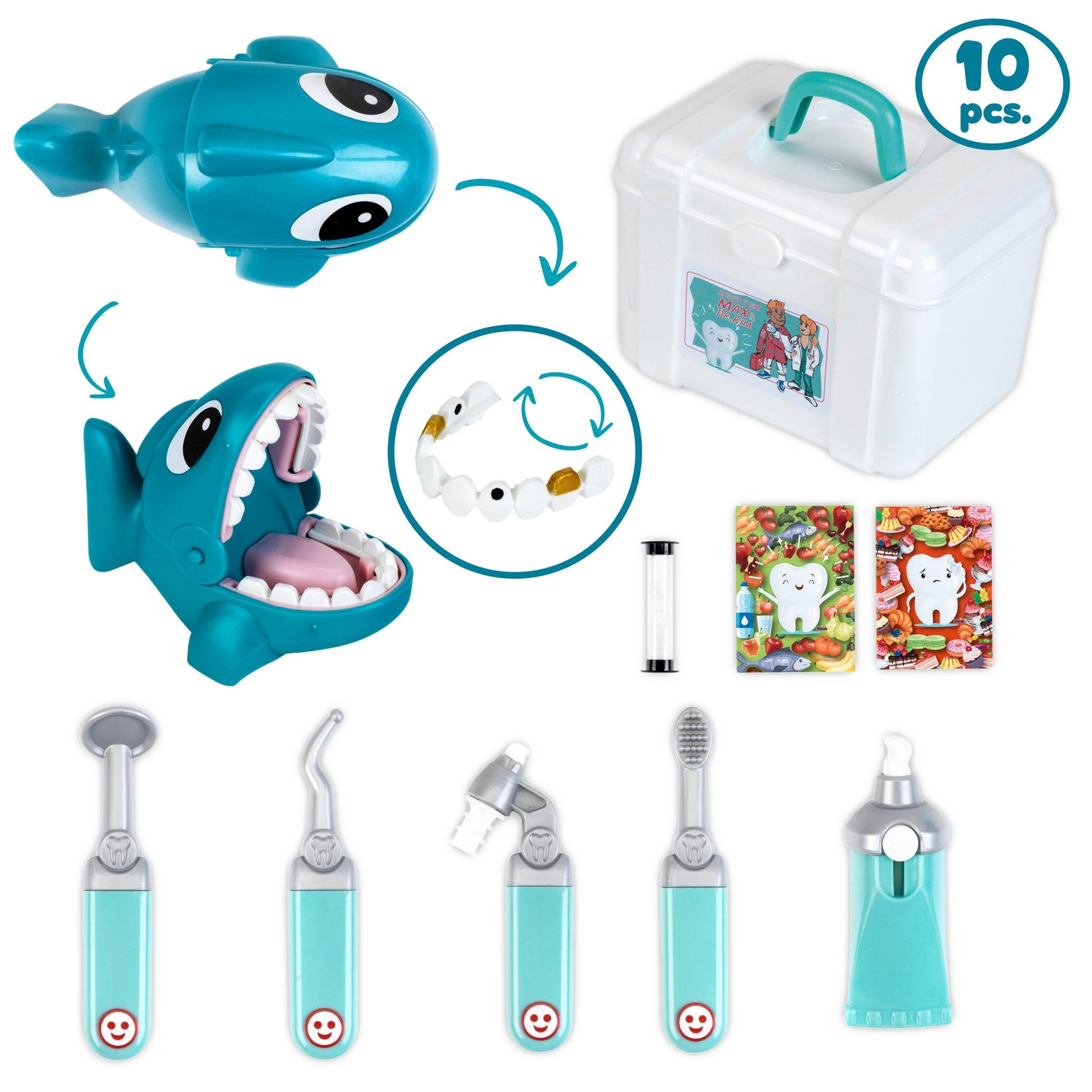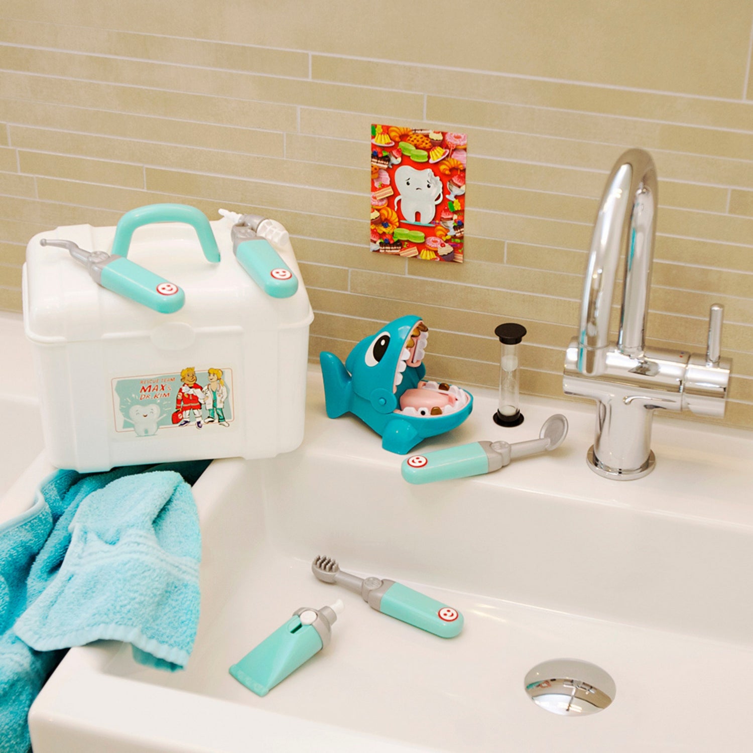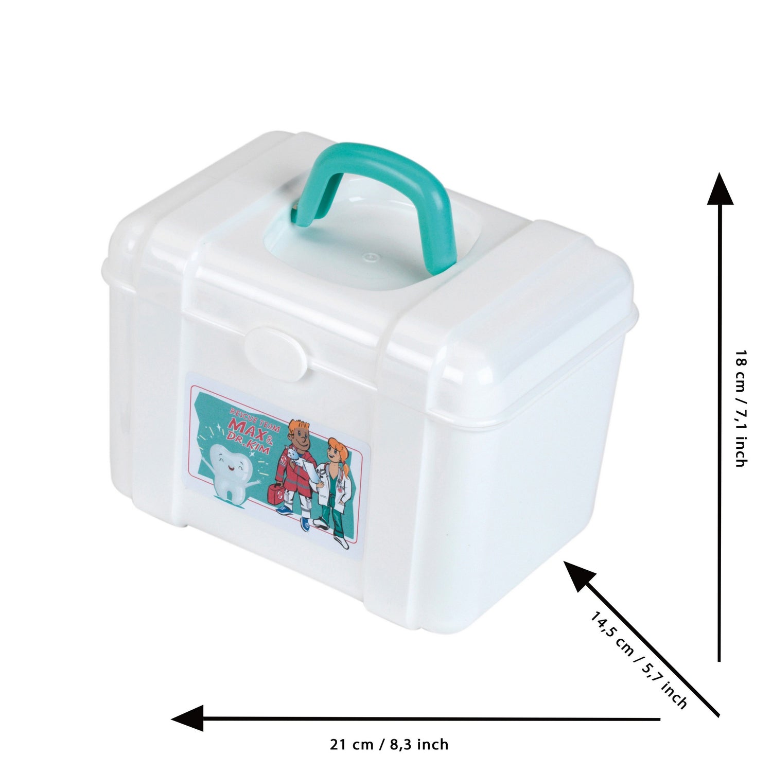 Der Zahnarztkoffer ist ein pädagogisches Spielzeug, das Kindern ermöglicht, spielerisch den Beruf des Zahnarztes kennenzulernen. Mit diesem Koffer können Kinder die Zähne eines kleinen Haifisches gründlich untersuchen und behandeln. Der Koffer ist robust und mit verschiedenen Zahnarztinstrumenten wie einem Bohrer, einem Spiegel, einer Spritze und vielem mehr ausgestattet. Ein lustiges Extra ist der kleine Hai, dessen Zähne auf einer Seite gesund sind, auf der anderen Seite jedoch kaputt und dringend behandelt werden müssen. Dies bietet den Kindern die Möglichkeit, sich in die Rolle des Zahnarztes zu versetzen und spielerisch zu lernen, wie wichtig die Zahngesundheit ist. Der Zahnarztkoffer ist ein ideales Spielzeug, um Kindern die Angst vor dem Besuch in der Zahnarztpraxis zu nehmen. Durch das spielerische Erleben können Kinder Vertrauen aufbauen und lernen, dass der Zahnarztbesuch gar nicht so schlimm ist. Der Koffer wurde in Deutschland hergestellt und hat die Maße 21 cm x 14,5 cm x 13 cm. Er ist für Kinder ab drei Jahren geeignet und bietet stundenlangen Spielspaß. Mit dem Zahnarztkoffer können Kinder nicht nur ihre Feinmotorik und Hand-Augen-Koordination verbessern, sondern auch Verantwortungsbewusstsein und Empathie entwickeln. Insgesamt ist der Zahnarztkoffer ein hochwertiges und pädagogisch wertvolles Spielzeug, das Kindern nicht nur Spaß macht, sondern auch wichtige Lektionen über Zahngesundheit und den Beruf des Zahnarztes vermittelt. Ein ideales Geschenk für kleine Entdecker, die gerne spielen und dabei etwas lernen möchten.