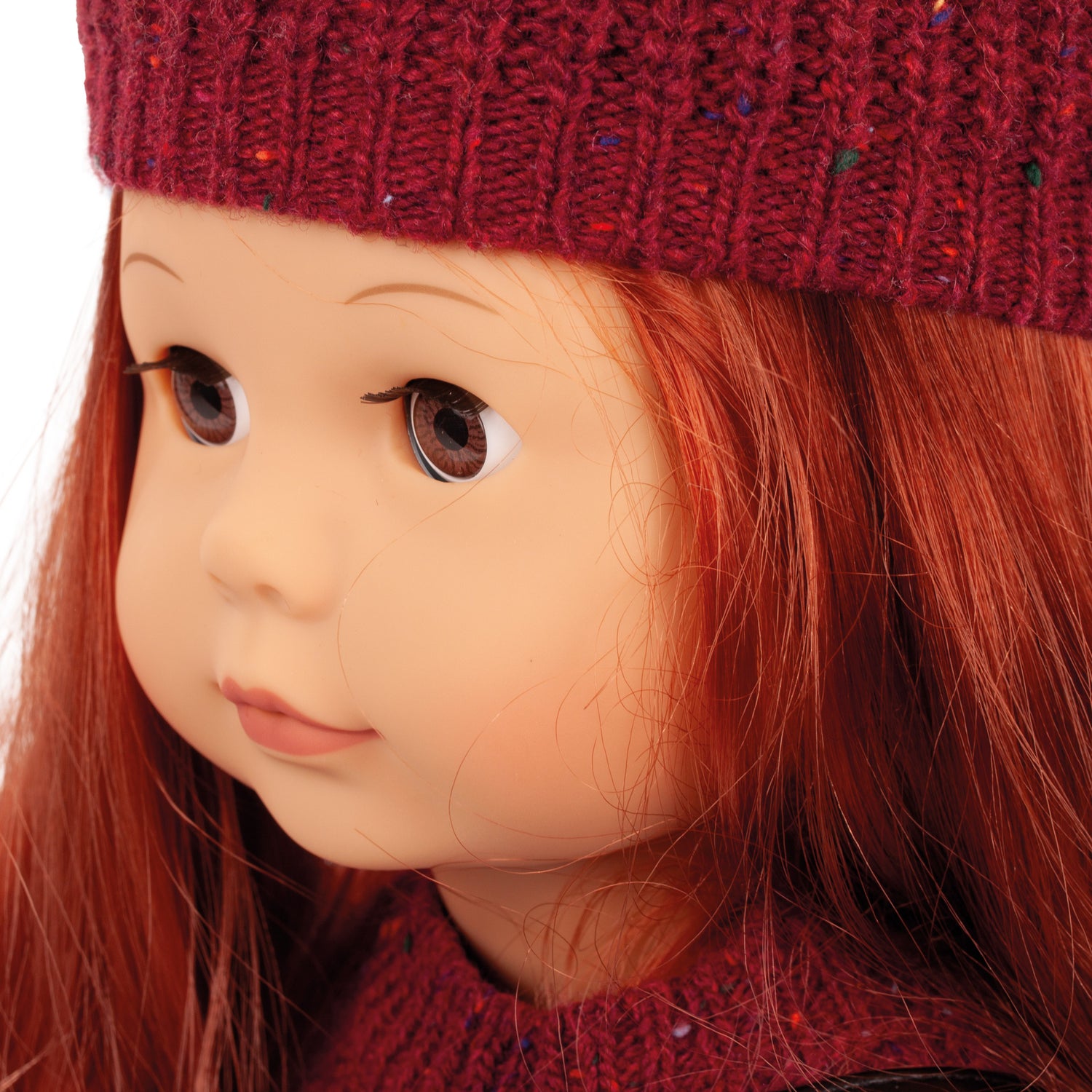 Precious Day Julia Jubilee von Götz in einem stilvollen Ensemble aus bordeauxfarbenem Rock, Pullover und Strickmütze. Schwarze Umhängetasche und elegante Stiefel vervollständigen das hochwertige Outfit. Diese Jubiläumsedition überzeugt durch exzellente Verarbeitung, edle Materialien und zeitloses Design – ideal für anspruchsvolle Käufer, die Wert auf Qualität, Langlebigkeit und durchdachtes Spielzeug legen.