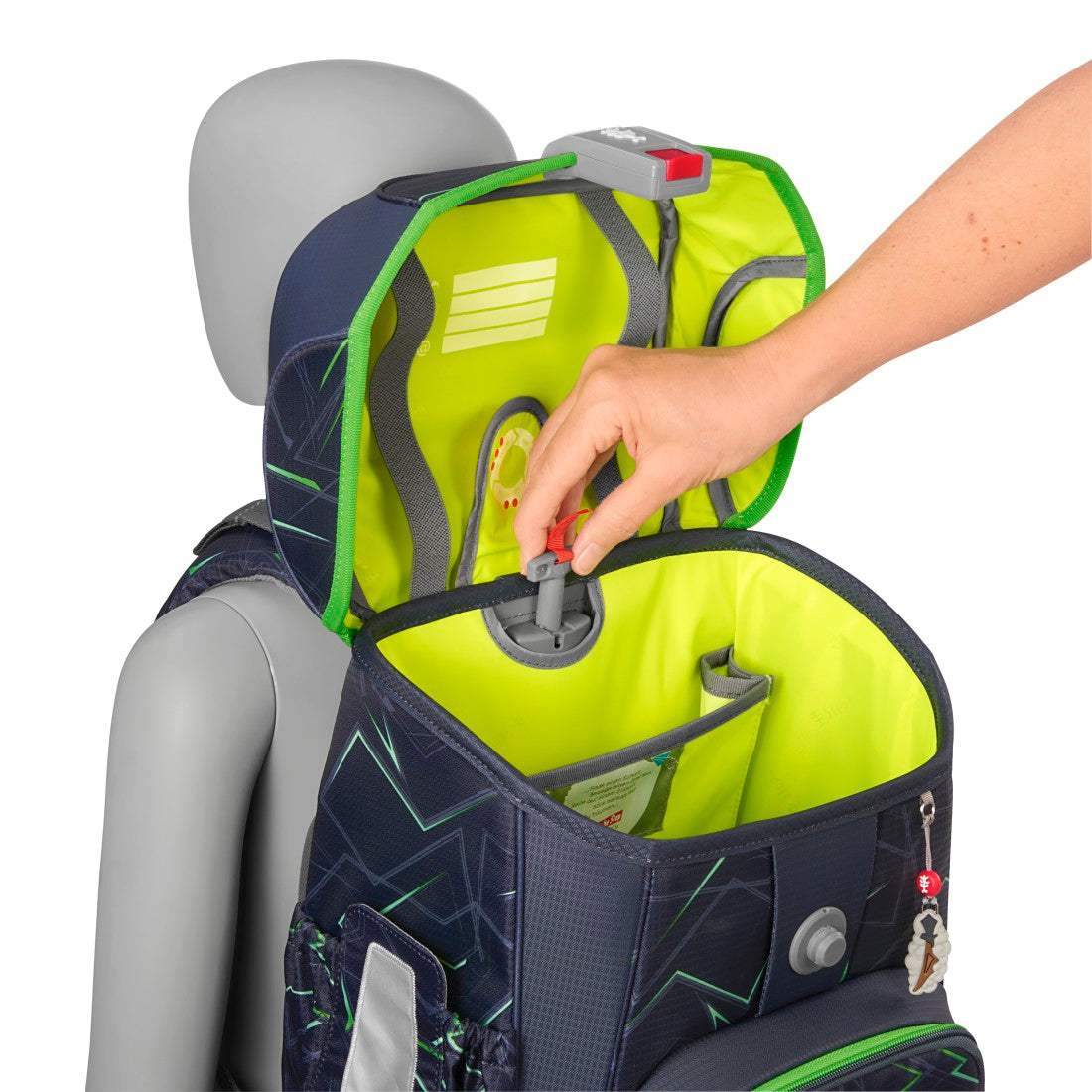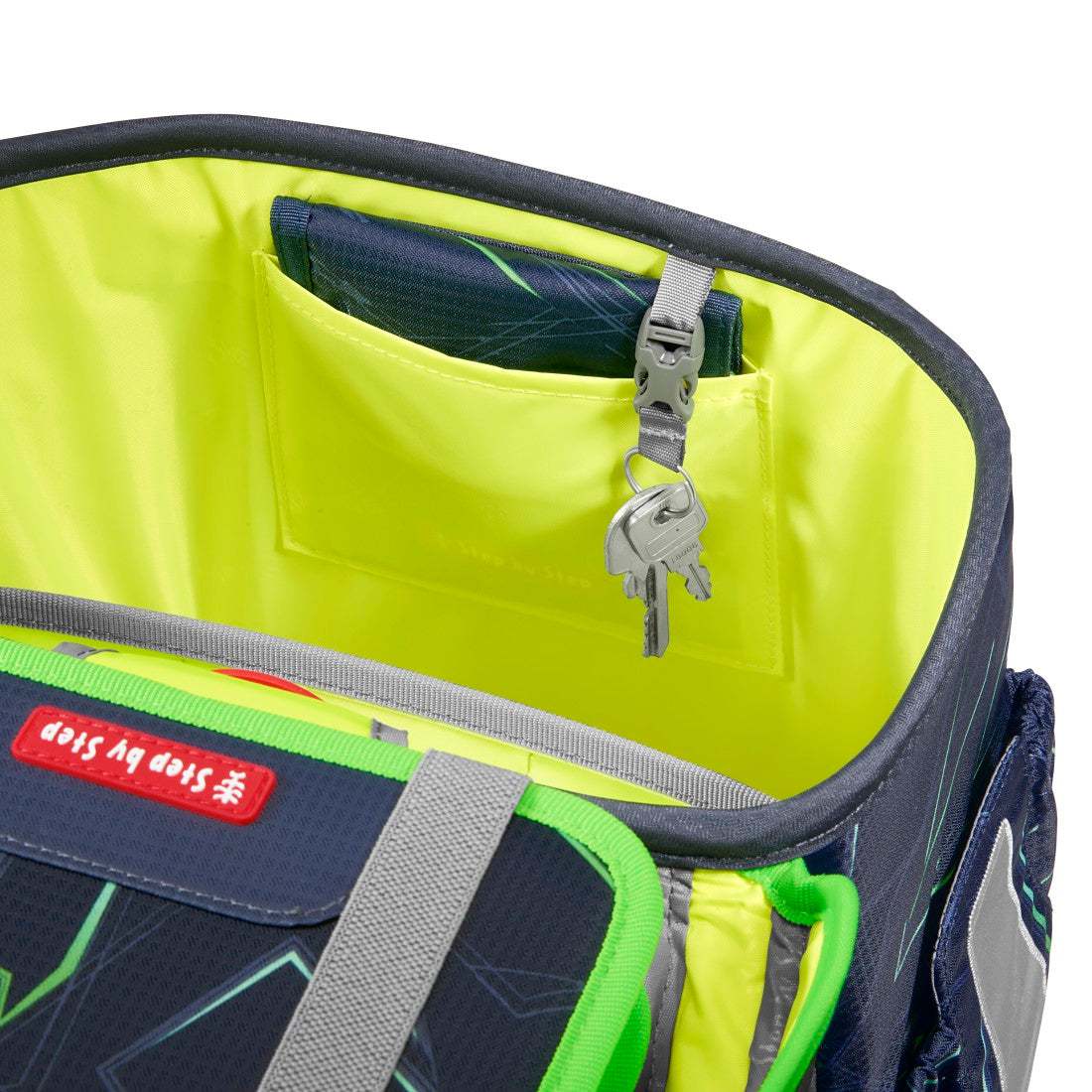 Mit einem Gewicht von unter 1000 g ist der Step by Step CLOUD schön leicht und für viele Kinder geeignet. Der Schulranzen ist besonders ergonomisch: Das Easy-Elastic-Backsystem - ultraleichte, elastische Fiberglas-Rückenkonstruktion - schmiegt sich dem Rücken an. Er hat speziell geformte Schultergurte und einen weichen Rücken. Außerdem hat er nicht nur einen höhenverstellbaren Brustgurt, sondern auch einen breiten, abnehmbaren Hüftgurt. Der Schulranzen hat zwei faltbare Seitentaschen, eine Vortasche mit Reißverschluss und das große Hauptfach. Dadurch ist genug Platz für alle Schulutensilien. Das Hauptfach ist durch ein Einhand-Schloss verschlossen, dass sich leicht mit einer Hand öffnen lässt. Eine weitere Besonderheit des Step by Step CLOUD sind die Magic Mags. Diese bestehen aus zwei Magnetmotiven und einem Anhänger. Die Magnete können dank der zwei Magnetflächen des Schulranzens (vorne und oben am Deckel) je nach Lust und Laune angebracht, gewechselt oder entfernt werden. Der Anhänger wird mit einer Lasche im Inneren des Ranzens befestigt.