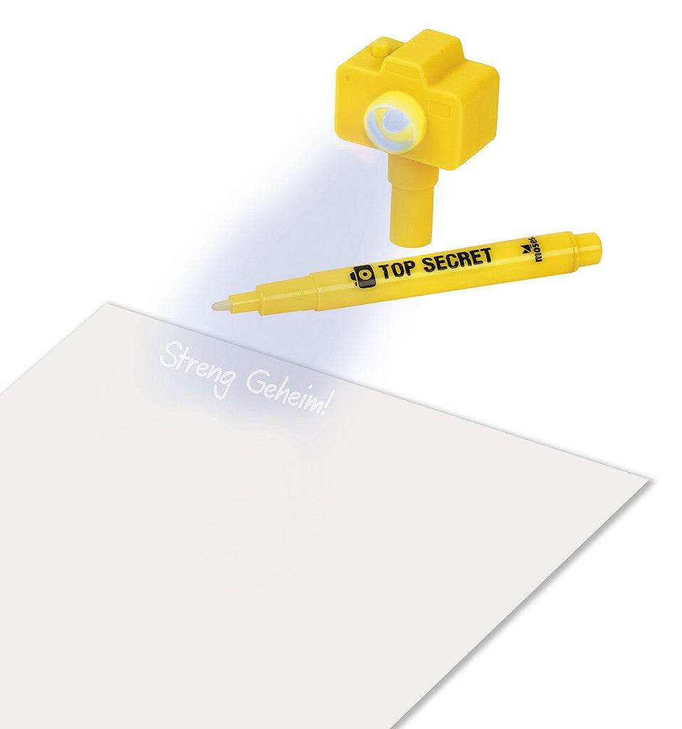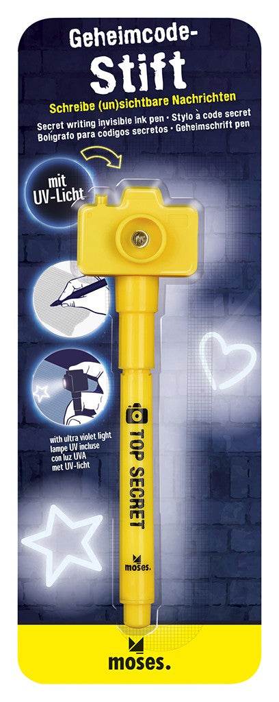 Dieser Geheimcodestift von Moses, enthält unsichtbare Tinte, mit der versteckte Nachrichten geschrieben werden können und mithilfe von UV- Licht werden diese wieder sichtbar.