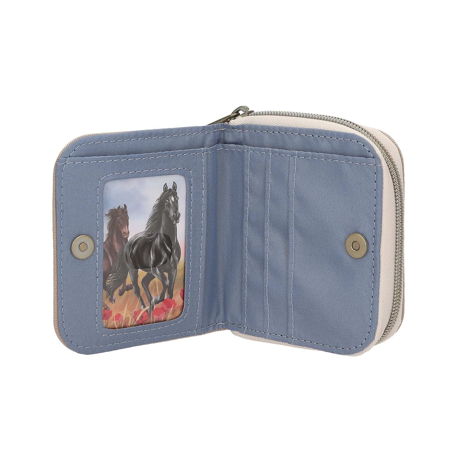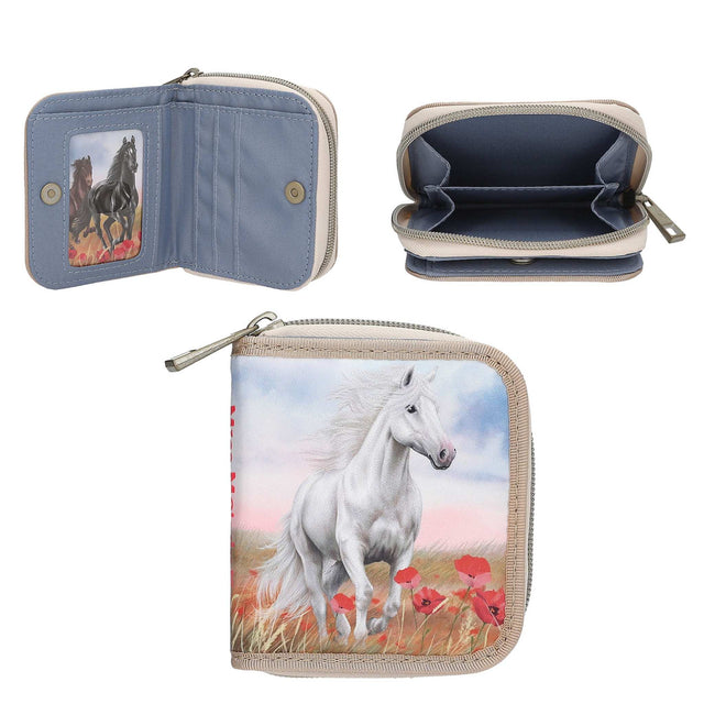 Das beigefarbene Portemonnaie von Miss Melody ist wie ein wahr gewordener Pferde- Traum: Auf der Front ist ein tolles Motiv von einem weißen Pferd in einem Feld voller roter Mohnblumen. Innen ist das Portemonnaie in schlichtem Rauchblau gehalten. Mit geteiltem Reißverschluss-Fach für Münzen, einem Fach für Scheine, diversen Kartenfächern sowie einem Namenskartenfach mit transparentem Fenster. Maße: 10 x 12 x 3 cm ( L(B/H) Altersempfehlung: 6 Jahre Material: 100 Prozent Polyester
